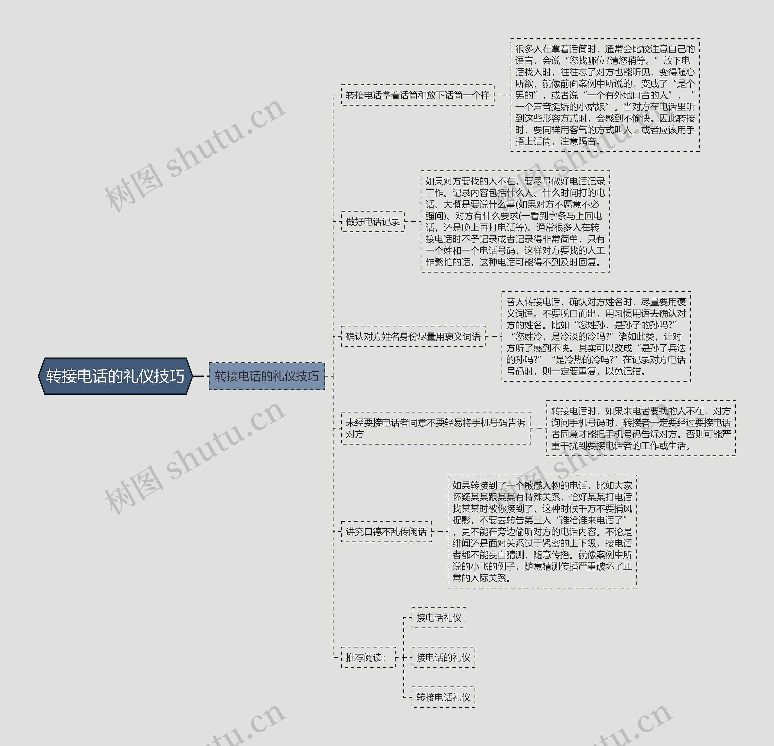 树图思维导图提供《转接电话的礼仪技巧》在线思维导图免费制作,点击“编辑”按钮,可对《转接电话的礼仪技巧》进行在线思维导图编辑,本思维导图属于思维导图模板主题,文件编号是:52da0e8ea888e9bee87dd391d5c968dc