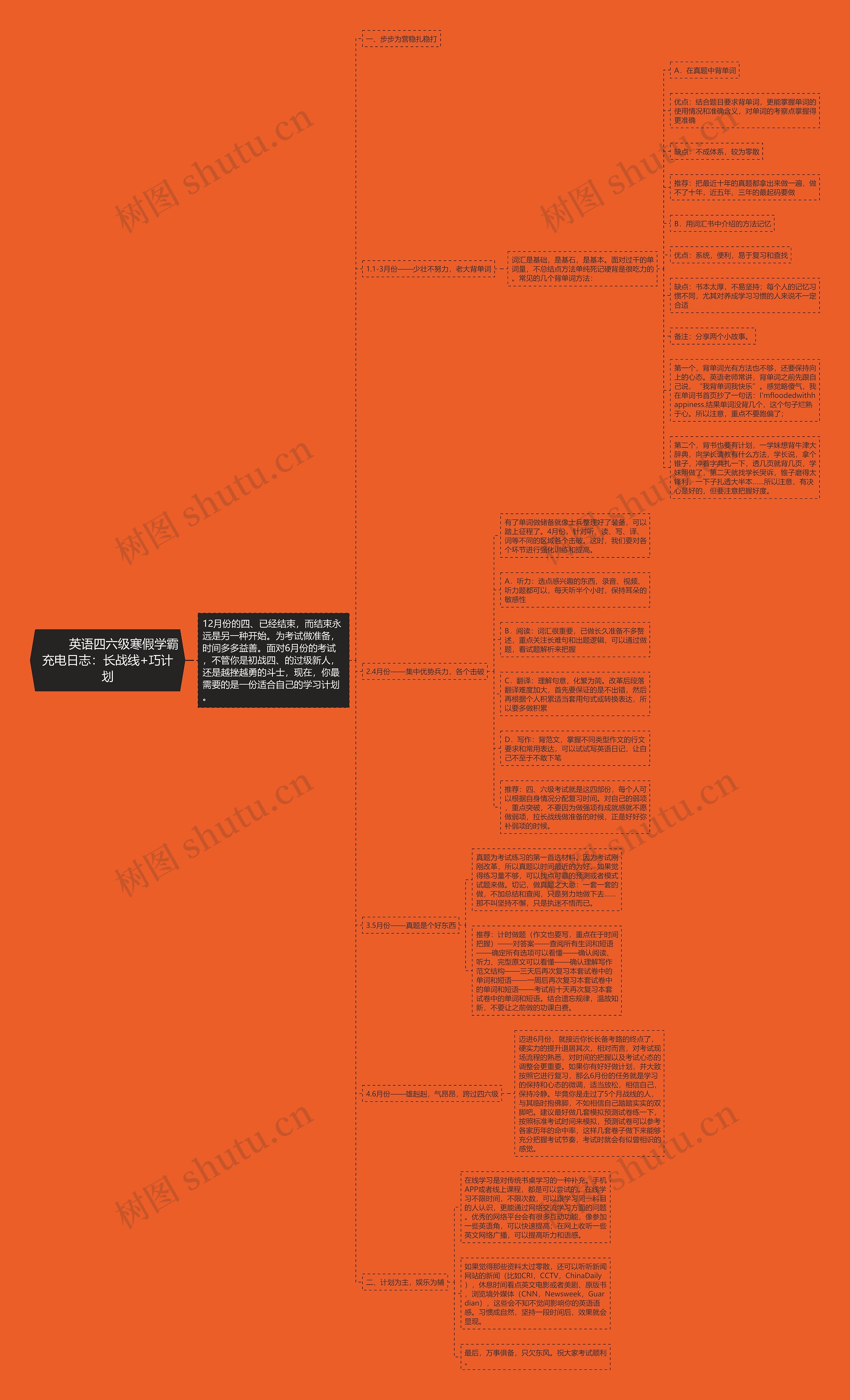 树图思维导图提供《 英语四六级寒假学霸充电日志:长战线+巧计划》在线思维导图免费制作,点击“编辑”按钮,可对《 英语四六级寒假学霸充电日志:长战线+巧计划》进行在线思维导图编辑,本思维导图属于思维导图模板主题,文件编号是:f9e059838071a14b0d1267134fad0ba6
