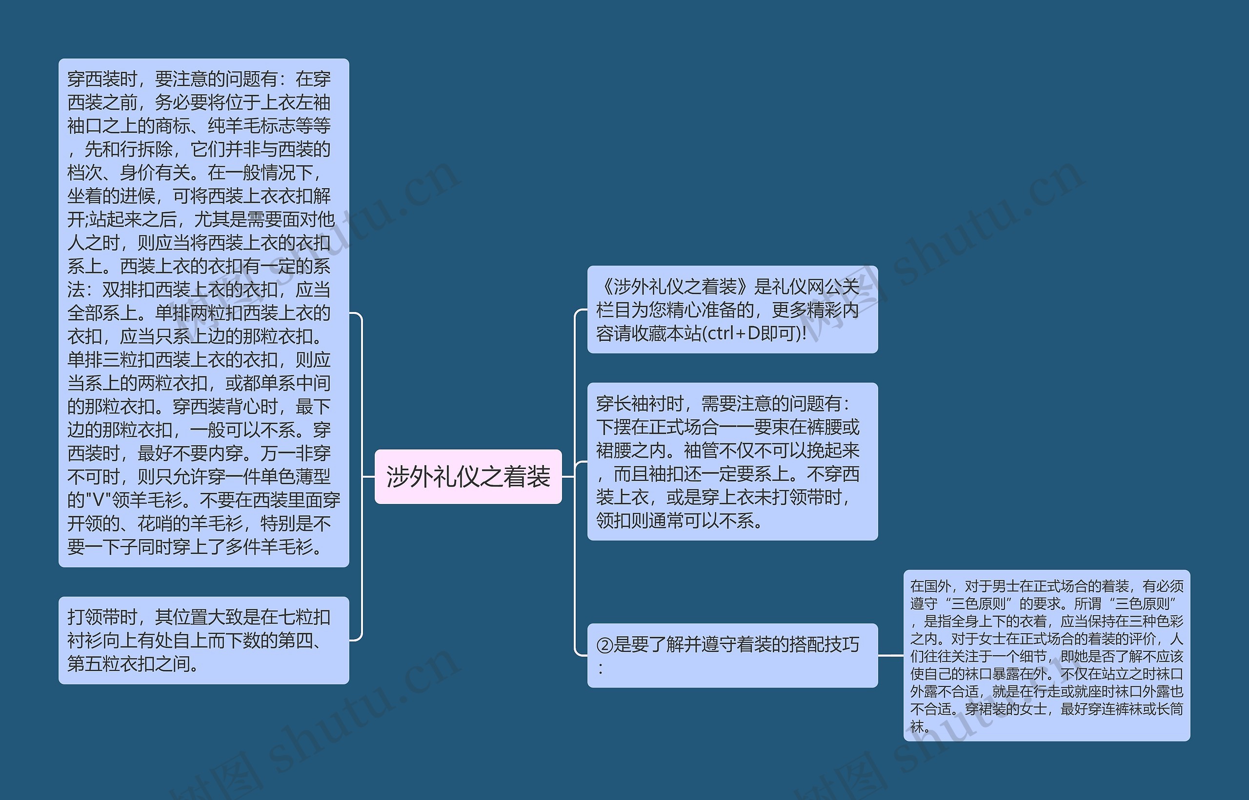 树图思维导图提供《涉外礼仪之着装》在线思维导图免费制作,点击“编辑”按钮,可对《涉外礼仪之着装》进行在线思维导图编辑,本思维导图属于思维导图模板主题,文件编号是:13f3892e7f09b02504c65e2553bcbdc3