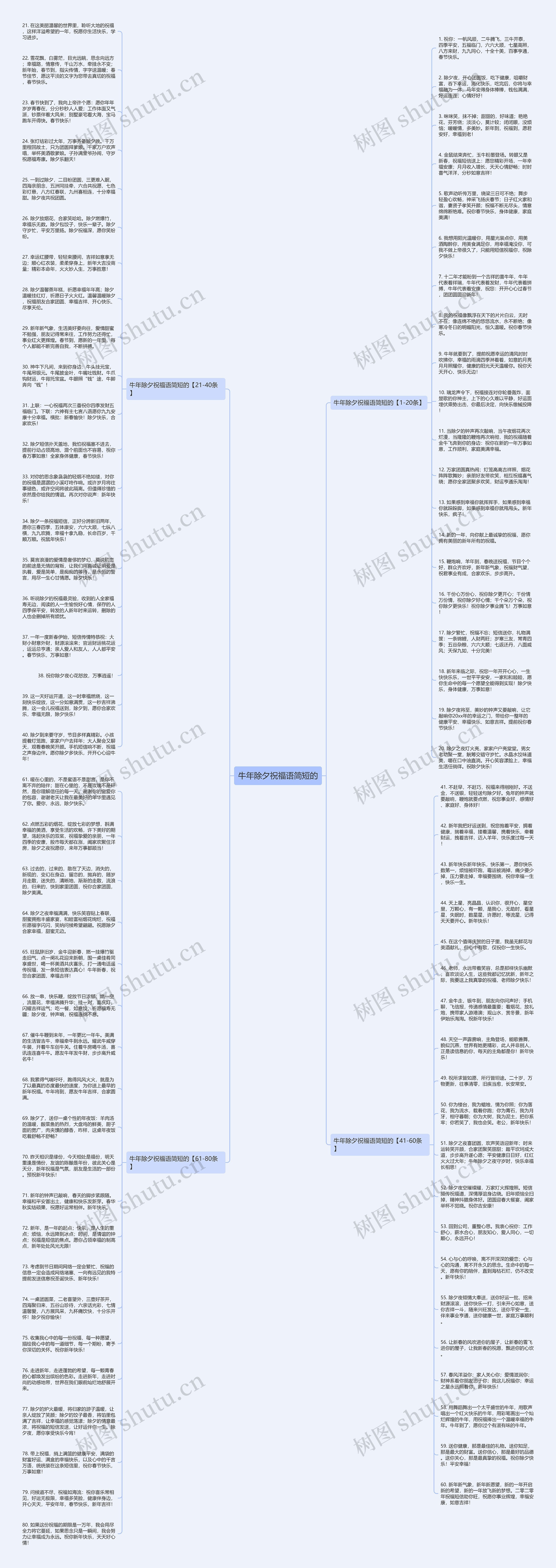 67. 催牛牛鞭到未年,一年更比一年牛。美满的生活皆吉牛,幸福牵牛到永远。耀武牛威穿牛装,开着牛车创牛关。住着牛房喝牛汤,喜讯连连喜牛牛。愿友牛年发牛财,步步高升威名牛!