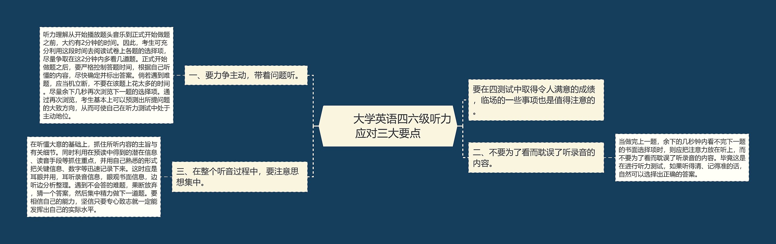 树图思维导图提供《 大学英语四六级听力应对三大要点》在线思维导图免费制作,点击“编辑”按钮,可对《 大学英语四六级听力应对三大要点》进行在线思维导图编辑,本思维导图属于思维导图模板主题,文件编号是:4bddcec6c5d8db5fc45e98965f8ab089