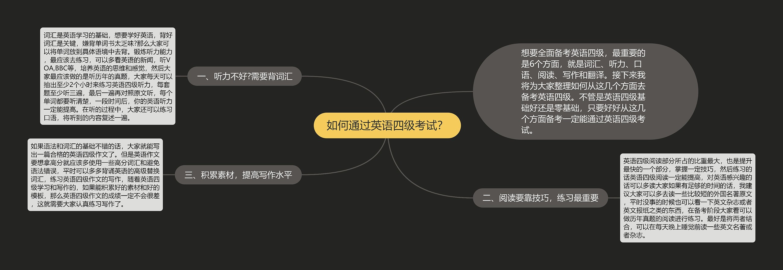 树图思维导图提供《如何通过英语四级考试?》在线思维导图免费制作,点击“编辑”按钮,可对《如何通过英语四级考试?》进行在线思维导图编辑,本思维导图属于思维导图模板主题,文件编号是:a828722c3f7088c63a169a3124602054