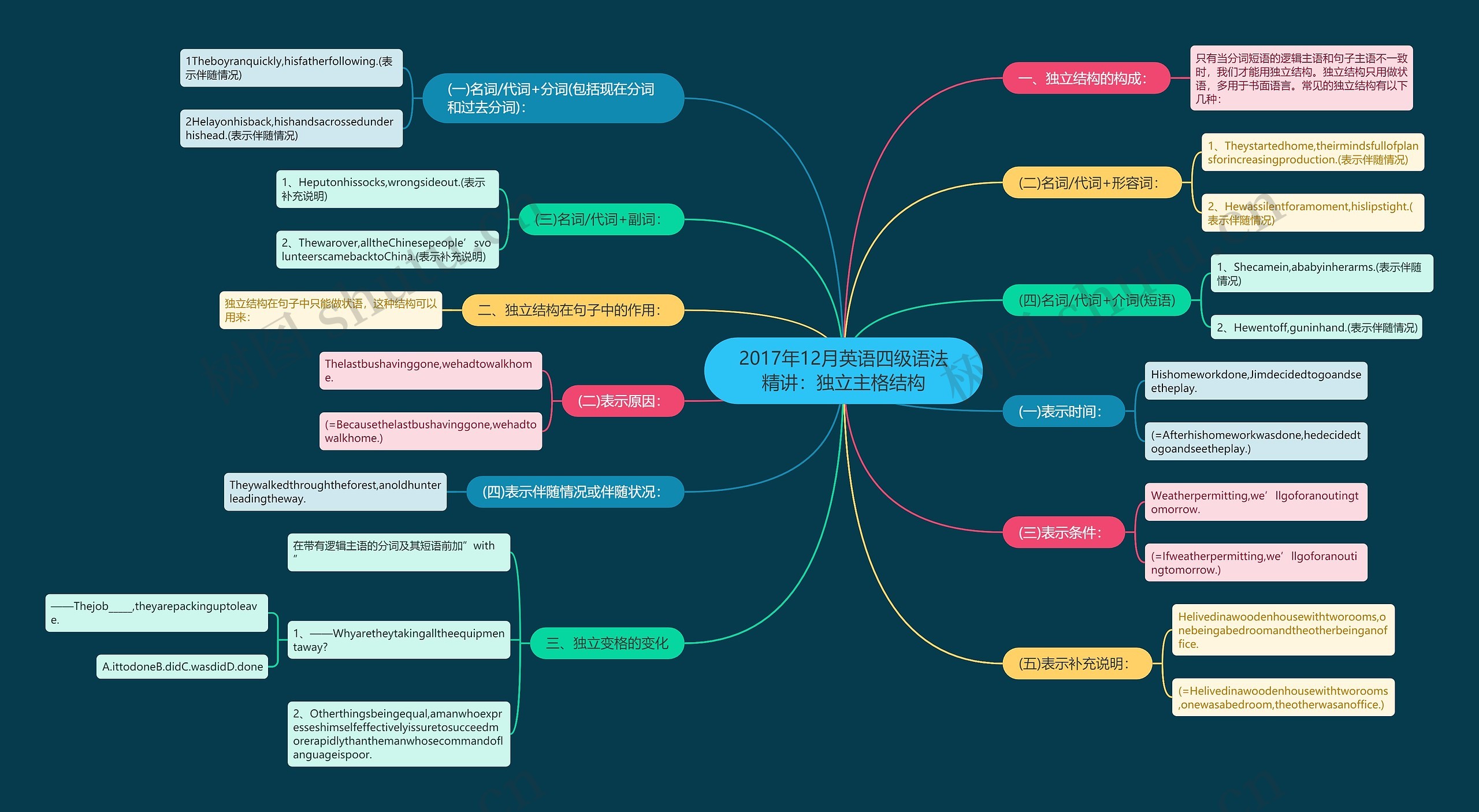 树图思维导图提供《2017年12月英语四级语法精讲:独立主格结构》在线思维导图免费制作,点击“编辑”按钮,可对《2017年12月英语四级语法精讲:独立主格结构》进行在线思维导图编辑,本思维导图属于思维导图模板主题,文件编号是:bef75754e103b3cf514cd2b290bb8a6f