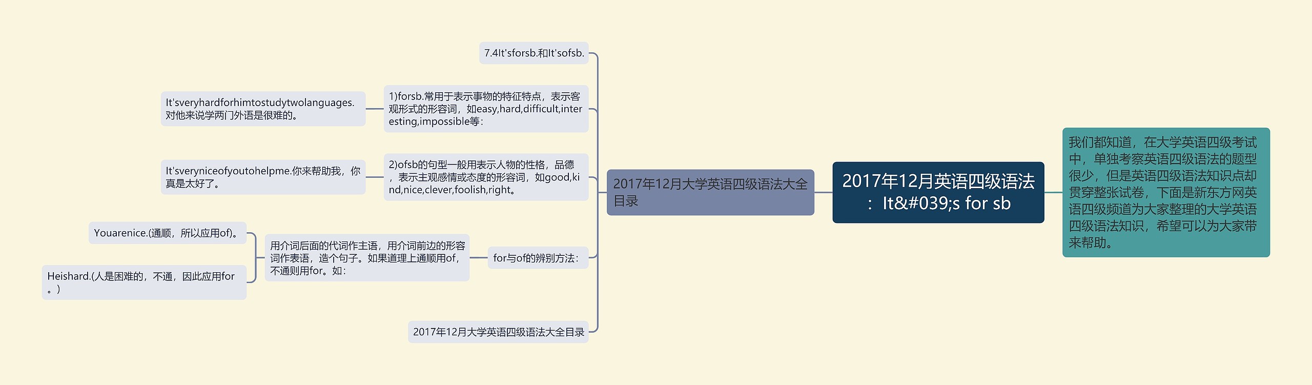 树图思维导图提供《2017年12月英语四级语法:It's for sb》在线思维导图免费制作,点击“编辑”按钮,可对《2017年12月英语四级语法:It's for sb》进行在线思维导图编辑,本思维导图属于思维导图模板主题,文件编号是:ffa83b60296779c0e5a92e72989d2877