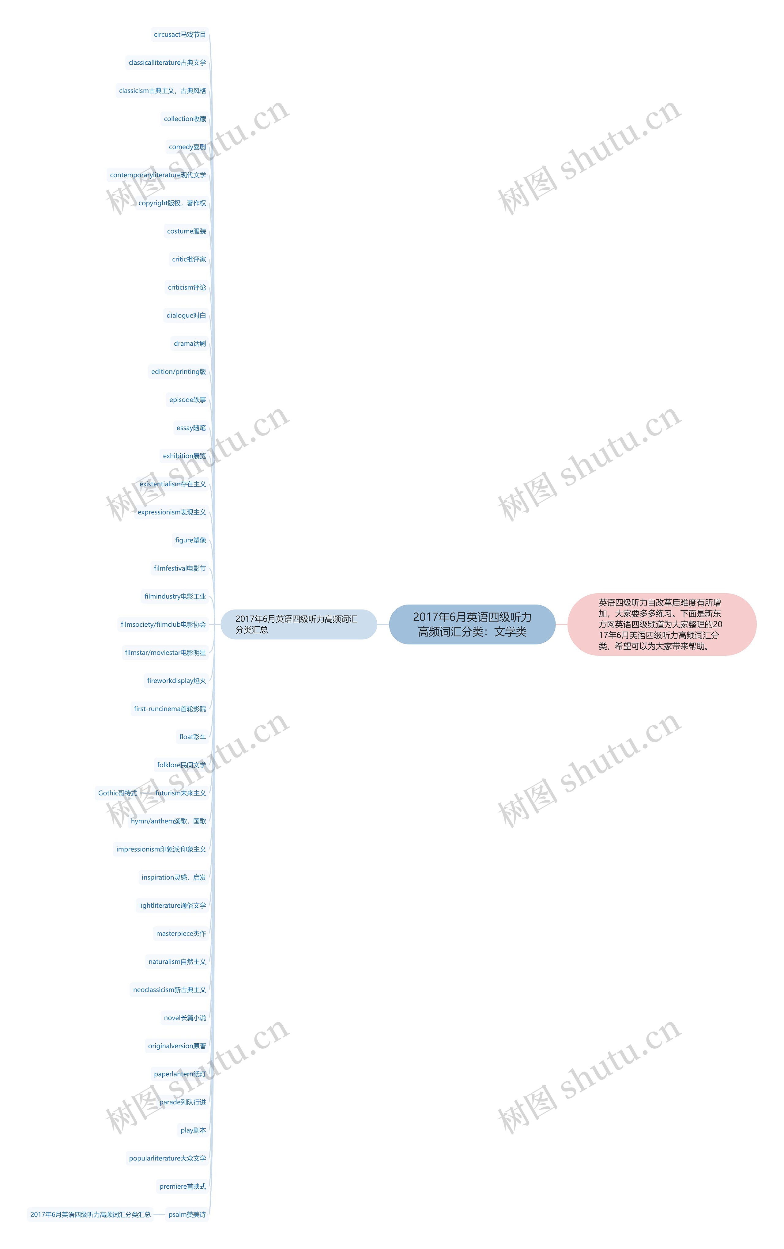 树图思维导图提供《2017年6月英语四级听力高频词汇分类:文学类》在线思维导图免费制作,点击“编辑”按钮,可对《2017年6月英语四级听力高频词汇分类:文学类》进行在线思维导图编辑,本思维导图属于思维导图模板主题,文件编号是:b781ce28b51616823a5a4b51e8014d83