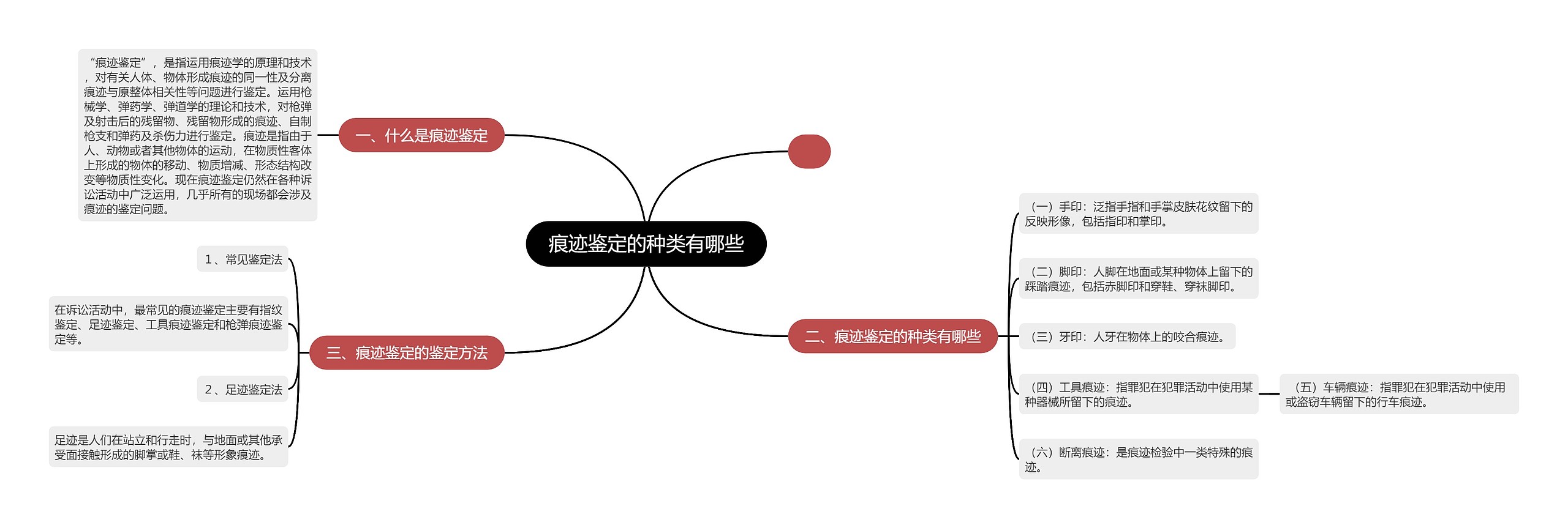 树图思维导图提供《痕迹鉴定的种类有哪些》在线思维导图免费制作,点击“编辑”按钮,可对《痕迹鉴定的种类有哪些》进行在线思维导图编辑,本思维导图属于思维导图模板主题,文件编号是:aaa8bbae5b270efd21724906b2f8e35f
