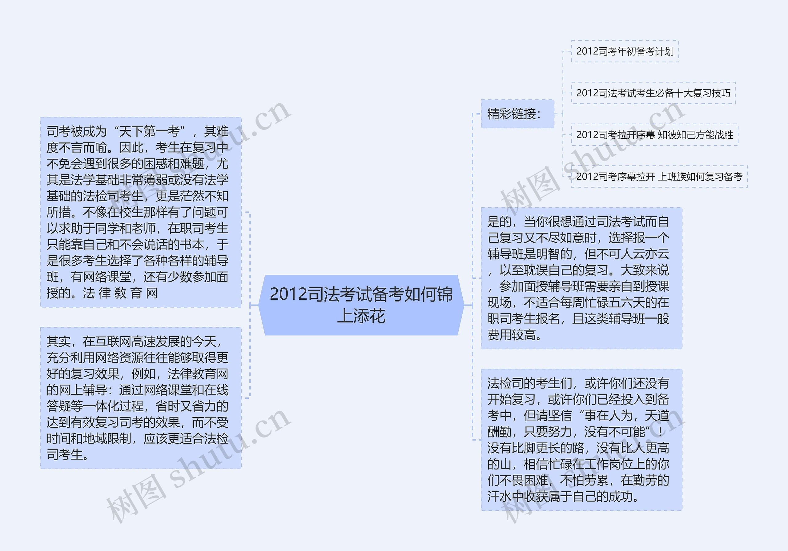 树图思维导图提供《2012司法考试备考如何锦上添花》在线思维导图免费制作,点击“编辑”按钮,可对《2012司法考试备考如何锦上添花》进行在线思维导图编辑,本思维导图属于思维导图模板主题,文件编号是:e20ba093e79a47487dba4dc3df112c30