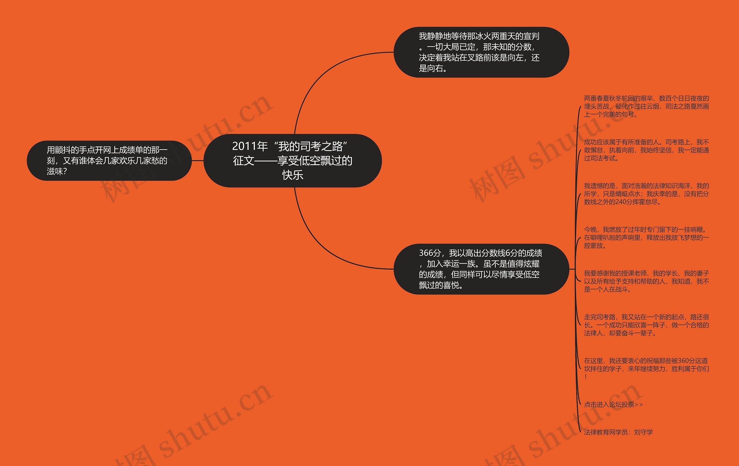 树图思维导图提供《2011年“我的司考之路”征文——享受低空飘过的快乐》在线思维导图免费制作,点击“编辑”按钮,可对《2011年“我的司考之路”征文——享受低空飘过的快乐》进行在线思维导图编辑,本思维导图属于思维导图模板主题,文件编号是:532d45f23b3a86a5d7ac5ec95b2d8e65