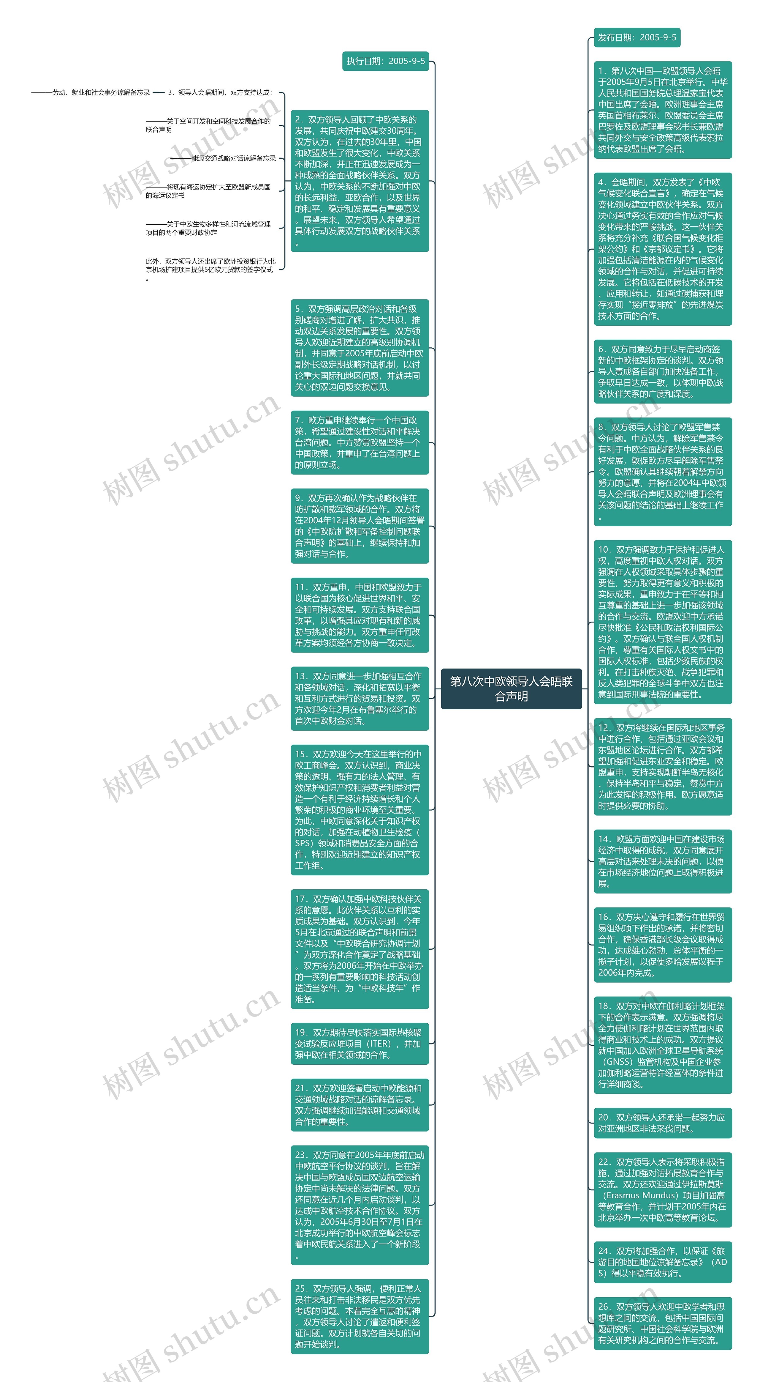 17.双方确认加强中欧科技伙伴关系的意愿。此伙伴关系以互利的实质成果为基础。双方认识到,今年5月在北京通过的联合声明和前景文件以及“中欧联合研究协调计划”为双方深化合作奠定了战略基础。双方将为2006年开始在中欧举办的一系列有重要影响的科技活动创造适当条件,为“中欧科技年”作准备。