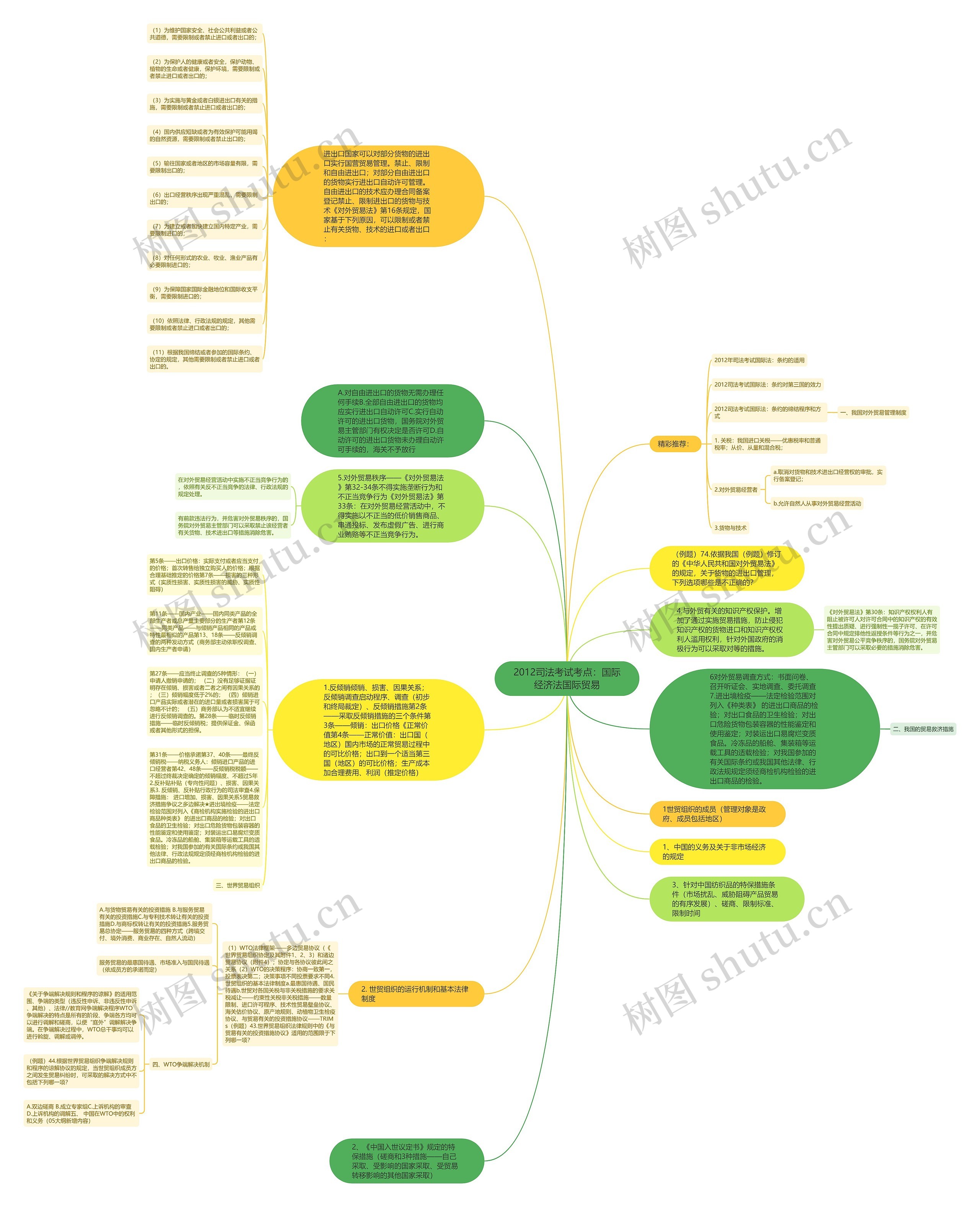 (1)WTO法律框架——多边贸易协议(《世界贸易组织协定及其附件1、2、3)和诸边贸易协议(附件4);协定与各协议彼此间之关系(2)WTO的决策程序:协商一致第一,投票表决第二;决策事项不同投票要求不同4.世贸组织的基本法律制度a.最惠国待遇、国民待遇b.世贸对各国关税与非关税措施的要求关税减让——约束性关税非关税措施——数量限制、进口许可程序、技术性贸易壁垒协议、海关估价协议、原产地规则、动植物卫生检疫协议、与贸易有关的投资措施协议——TRIMs(例题)43.世界贸易组织法律规则中的《与贸易有关的投资措施协议》适用的范围限于下列哪一项?