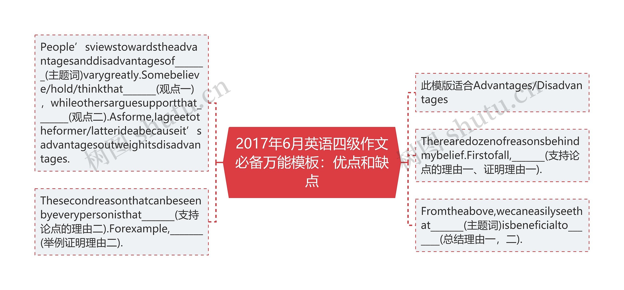 树图思维导图提供《2017年6月英语四级作文必备万能模板:优点和缺点》在线思维导图免费制作,点击“编辑”按钮,可对《2017年6月英语四级作文必备万能模板:优点和缺点》进行在线思维导图编辑,本思维导图属于思维导图模板主题,文件编号是:872ae9236895ced1860cd75eb9582ef6