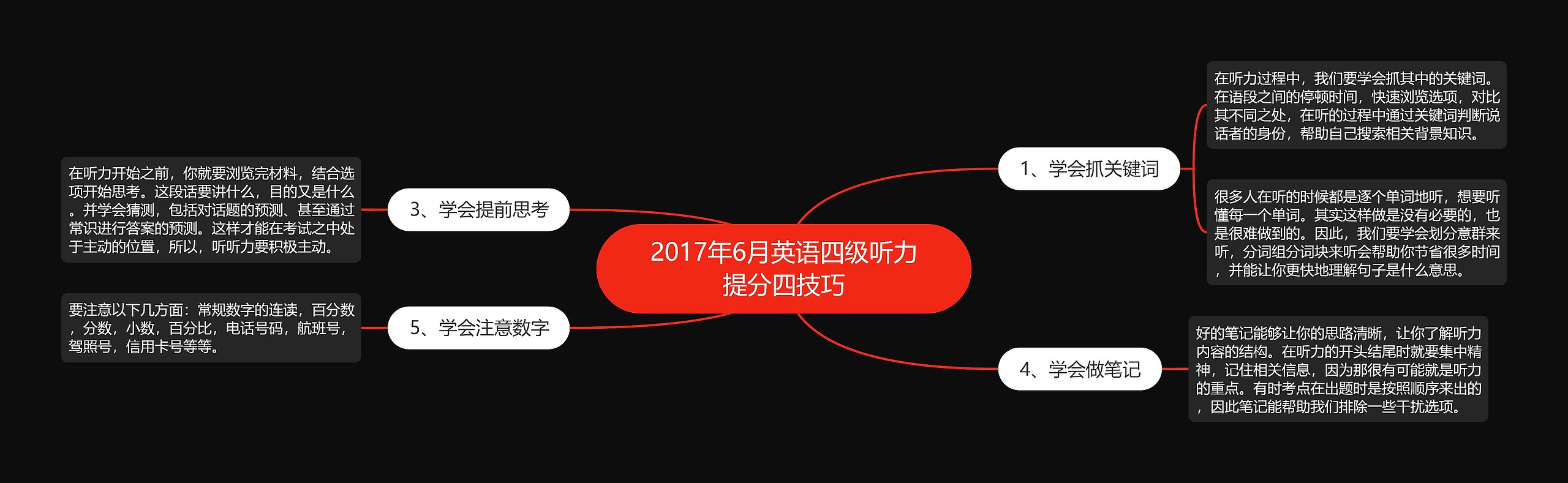 树图思维导图提供《2017年6月英语四级听力提分四技巧》在线思维导图免费制作,点击“编辑”按钮,可对《2017年6月英语四级听力提分四技巧》进行在线思维导图编辑,本思维导图属于思维导图模板主题,文件编号是:4942ccb2965dc6130eff96d5c6e886b5
