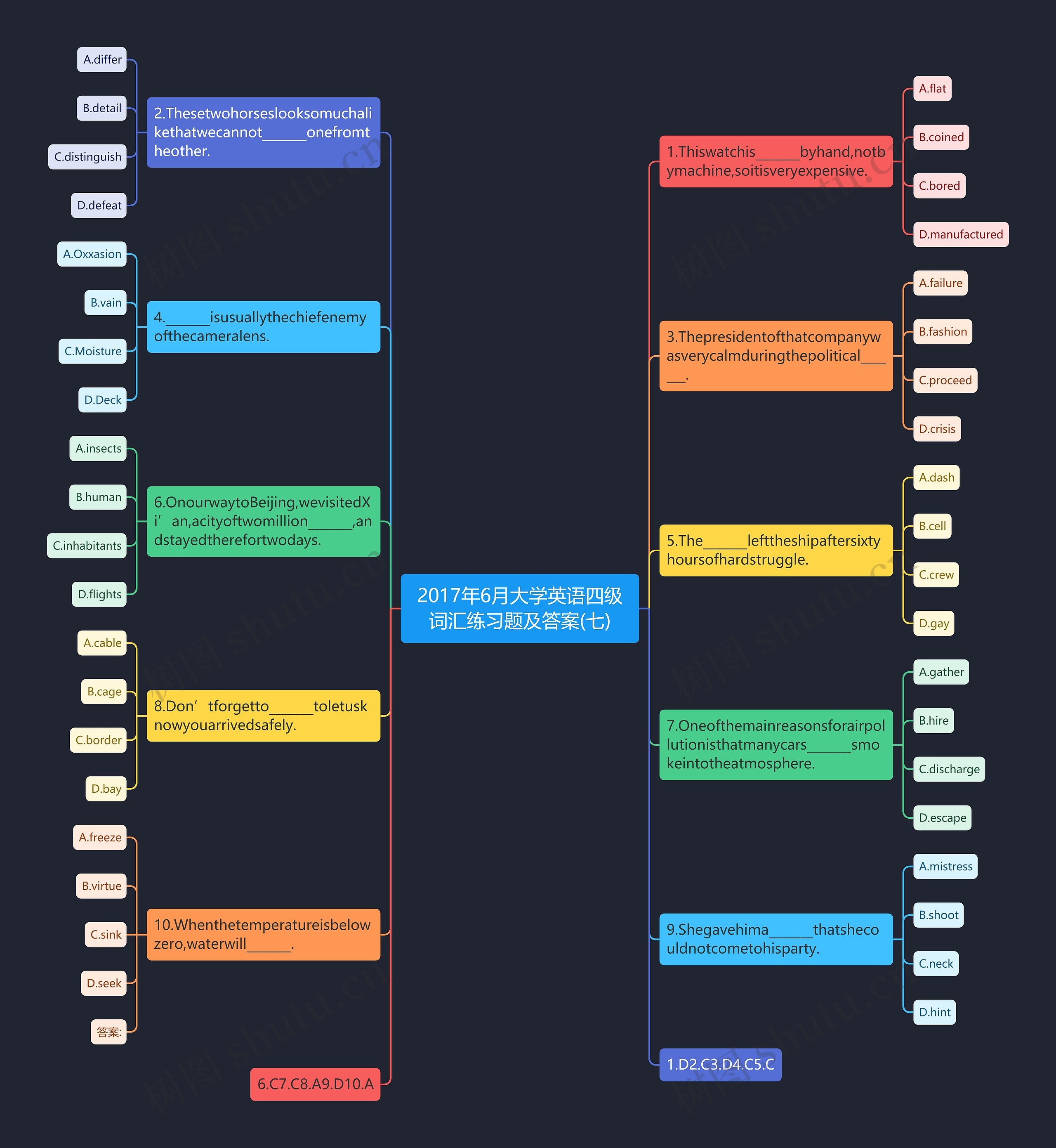 树图思维导图提供《2017年6月大学英语四级词汇练习题及答案(七)》在线思维导图免费制作,点击“编辑”按钮,可对《2017年6月大学英语四级词汇练习题及答案(七)》进行在线思维导图编辑,本思维导图属于思维导图模板主题,文件编号是:4a934dc9723f17da4b21226d27f37347