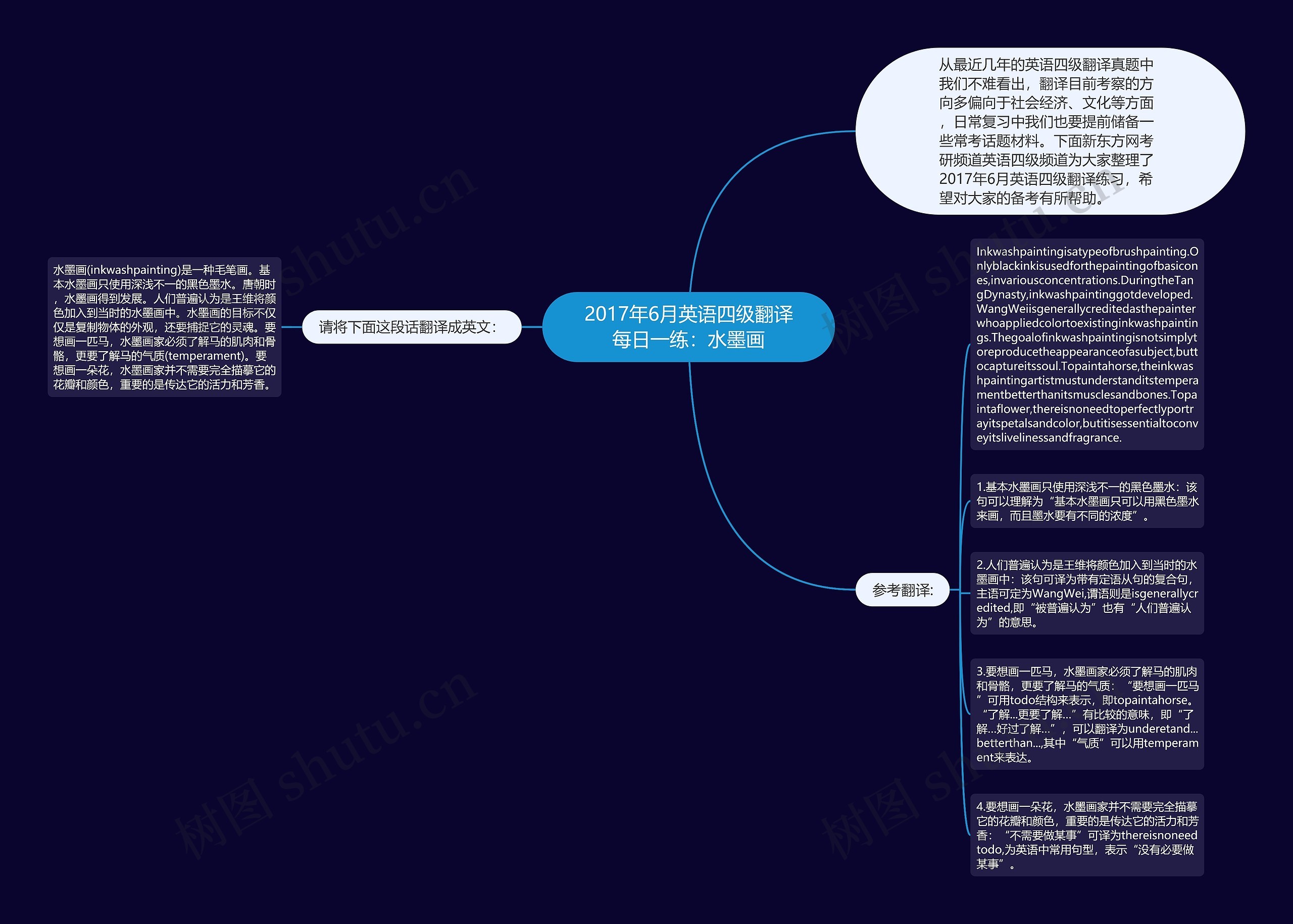1.基本水墨画只使用深浅不一的黑色墨水:该句可以理解为“基本水墨画只可以用黑色墨水来画,而且墨水要有不同的浓度”。