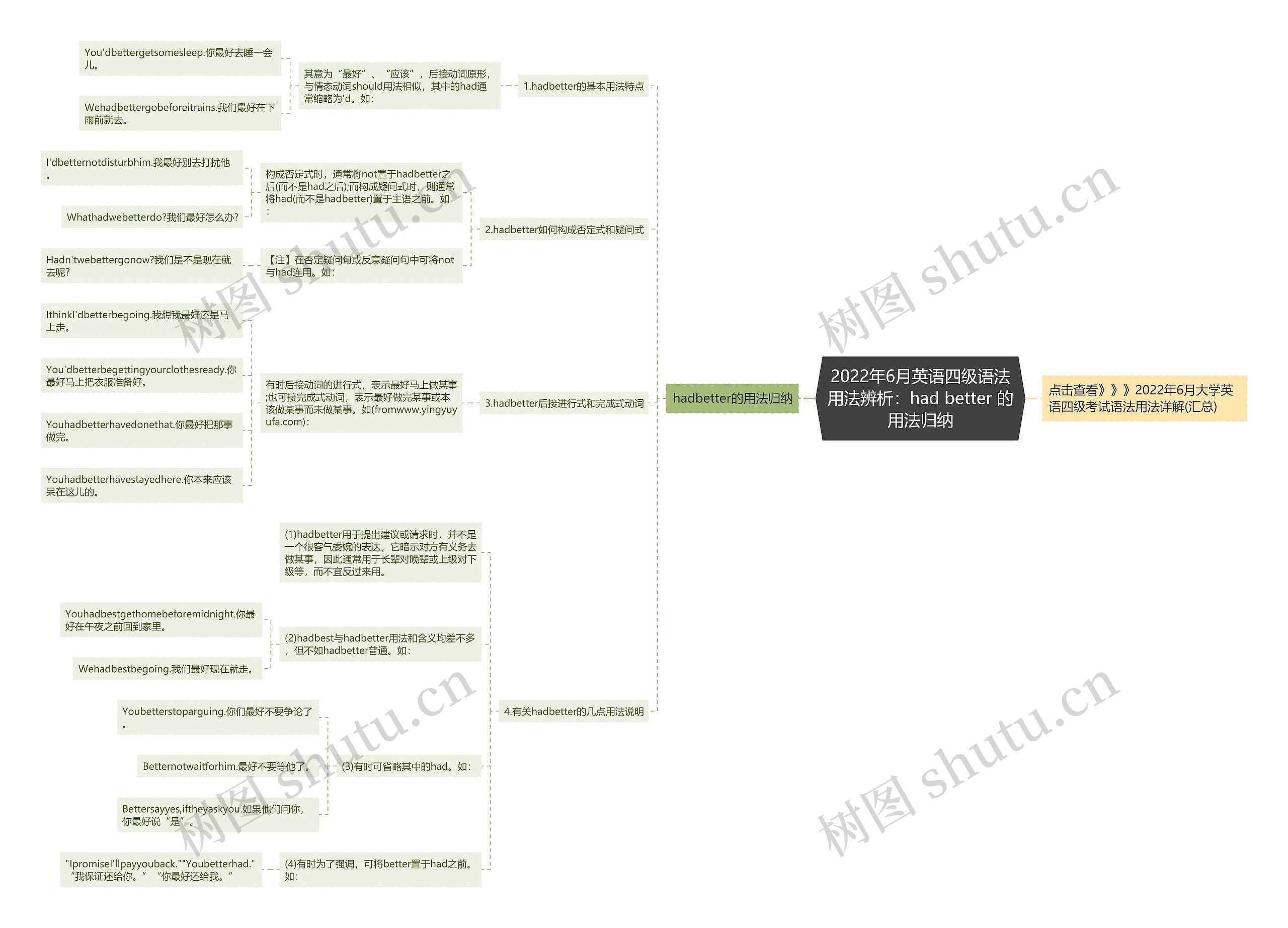 树图思维导图提供《2022年6月英语四级语法用法辨析:had better 的用法归纳》在线思维导图免费制作,点击“编辑”按钮,可对《2022年6月英语四级语法用法辨析:had better 的用法归纳》进行在线思维导图编辑,本思维导图属于思维导图模板主题,文件编号是:b45d4013b7bcab3f219ee6fb584188db