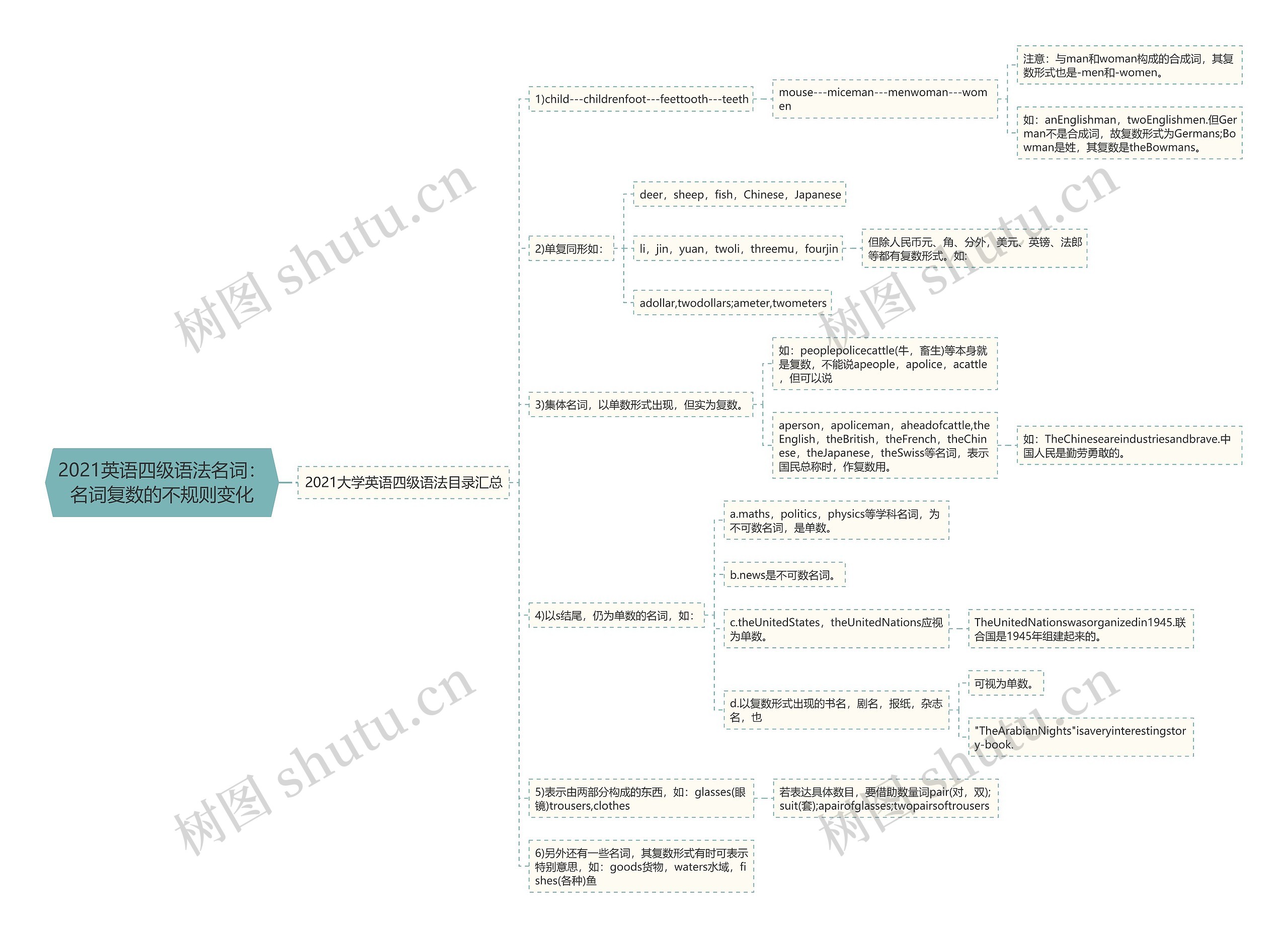 树图思维导图提供《2021英语四级语法名词:名词复数的不规则变化》在线思维导图免费制作,点击“编辑”按钮,可对《2021英语四级语法名词:名词复数的不规则变化》进行在线思维导图编辑,本思维导图属于思维导图模板主题,文件编号是:59f2fe14d48050e97ad8c6af85033307