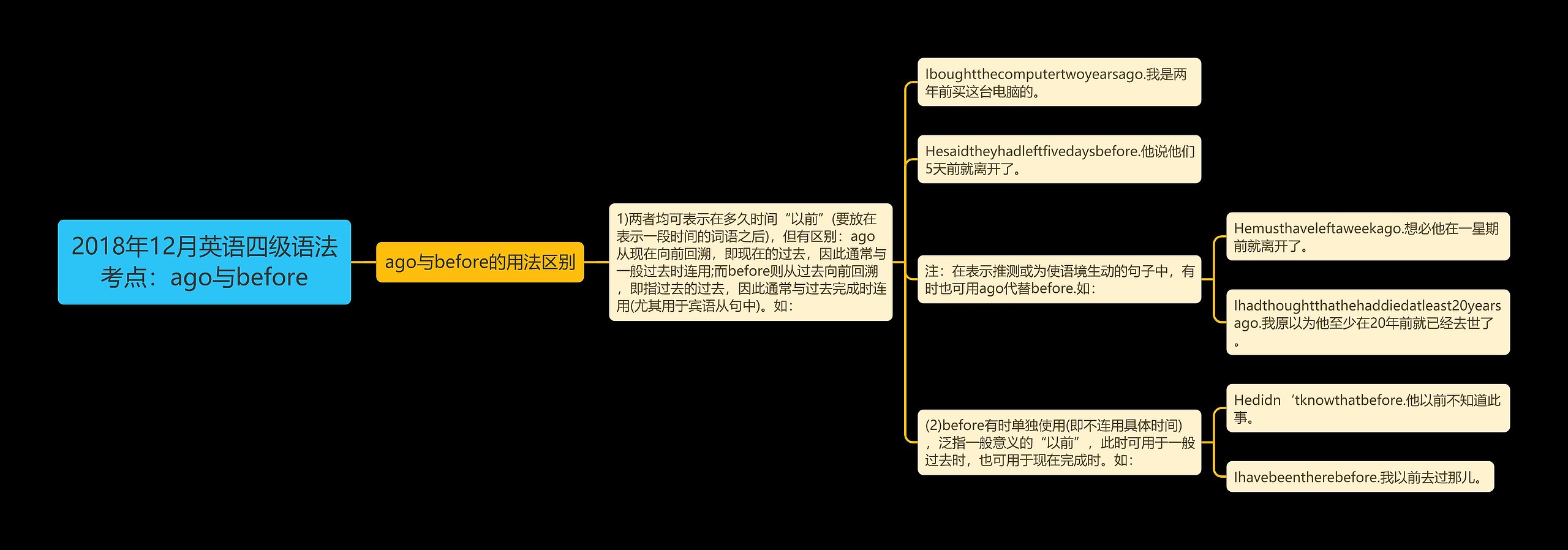 树图思维导图提供《2018年12月英语四级语法考点:ago与before》在线思维导图免费制作,点击“编辑”按钮,可对《2018年12月英语四级语法考点:ago与before》进行在线思维导图编辑,本思维导图属于思维导图模板主题,文件编号是:406c537ab6f5ac5832a4bfc9fd991399