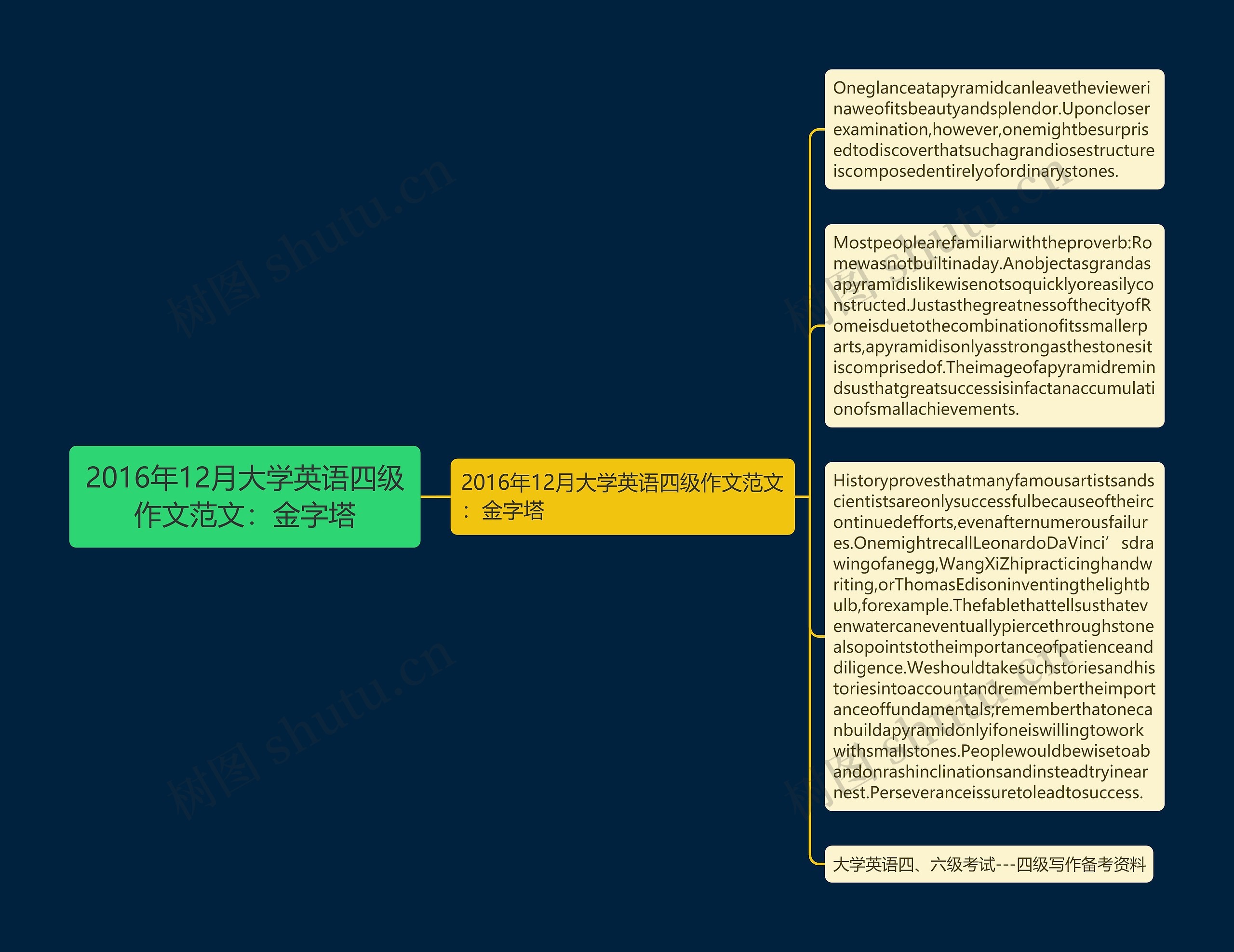 Mostpeoplearefamiliarwiththeproverb:Romewasnotbuiltinaday.Anobjectasgrandasapyramidislikewisenotsoquicklyoreasilyconstructed.JustasthegreatnessofthecityofRomeisduetothecombinationofitssmallerparts,apyramidisonlyasstrongasthestonesitiscomprisedof.Theimageofapyramidremindsusthatgreatsuccessisinfactanaccumulationofsmallachievements.