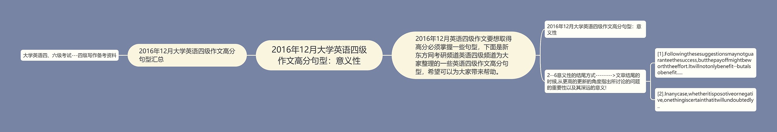 树图思维导图提供《2016年12月大学英语四级作文高分句型:意义性》在线思维导图免费制作,点击“编辑”按钮,可对《2016年12月大学英语四级作文高分句型:意义性》进行在线思维导图编辑,本思维导图属于思维导图模板主题,文件编号是:cf9150acb983bcb2503e88c4bc4134b3