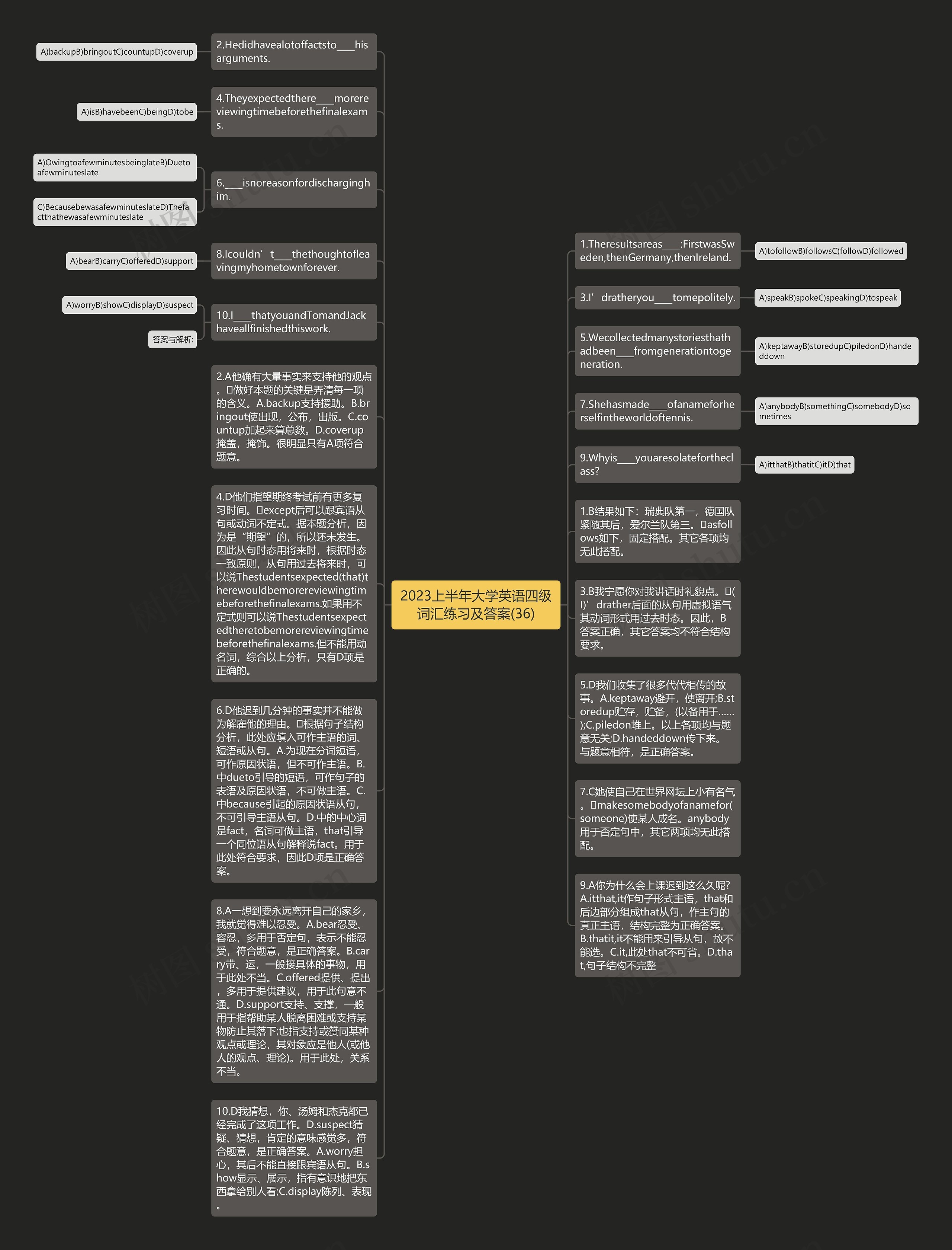 4.D他们指望期终考试前有更多复习时间。except后可以跟宾语从句或动词不定式。据本题分析,因为是“期望”的,所以还未发生。因此从句时态用将来时,根据时态一致原则,从句用过去将来时,可以说Thestudentsexpected(that)therewouldbemorereviewingtimebeforethefinalexams.如果用不定式则可以说Thestudentsexpectedtheretobemorereviewingtimebeforethefinalexams.但不能用动名词,综合以上分析,只有D项是正确的。