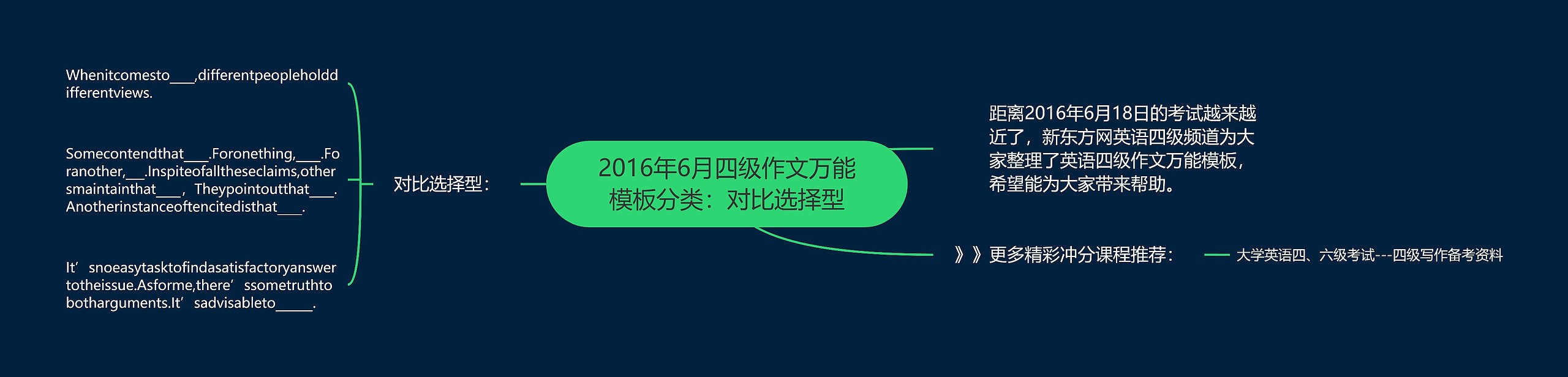 树图思维导图提供《2016年6月四级作文万能模板分类:对比选择型》在线思维导图免费制作,点击“编辑”按钮,可对《2016年6月四级作文万能模板分类:对比选择型》进行在线思维导图编辑,本思维导图属于思维导图模板主题,文件编号是:b6ac710cb5610d7f6c337210097a625d
