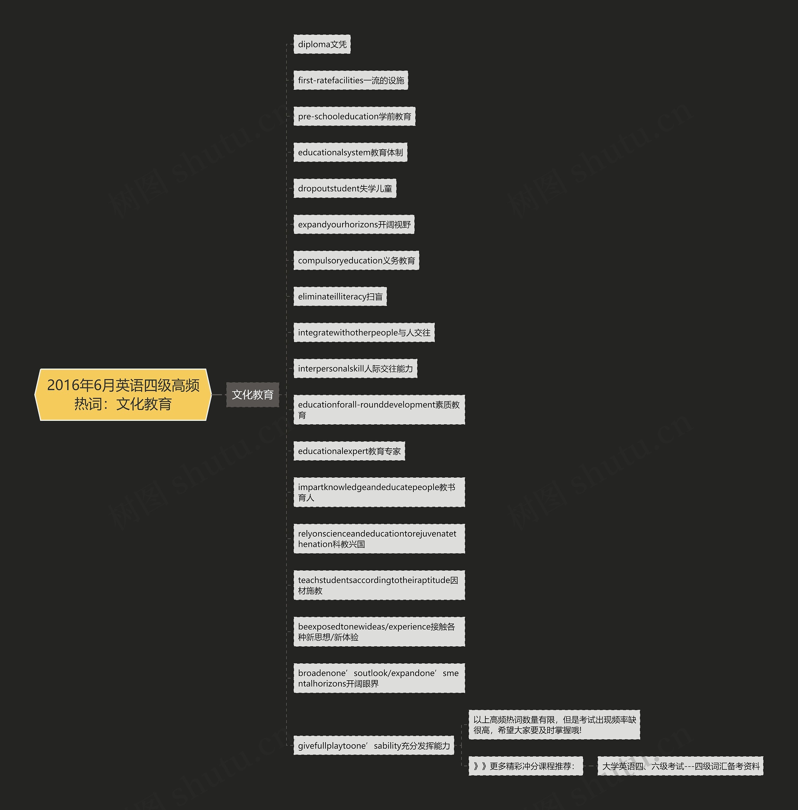 树图思维导图提供《2016年6月英语四级高频热词:文化教育》在线思维导图免费制作,点击“编辑”按钮,可对《2016年6月英语四级高频热词:文化教育》进行在线思维导图编辑,本思维导图属于思维导图模板主题,文件编号是:f234e3d8b9080913ee8f083b00b26359