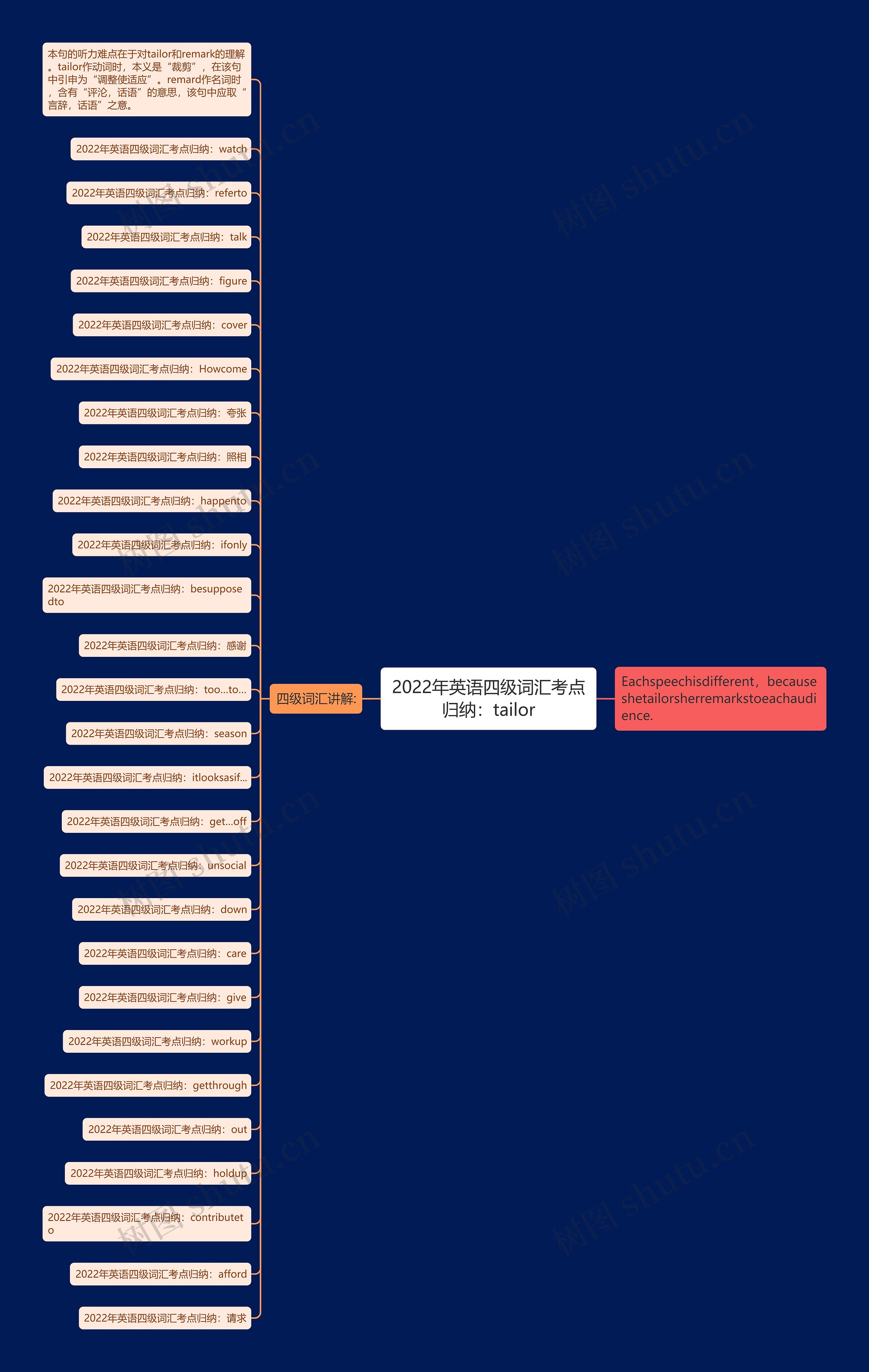 树图思维导图提供《2022年英语四级词汇考点归纳:tailor》在线思维导图免费制作,点击“编辑”按钮,可对《2022年英语四级词汇考点归纳:tailor》进行在线思维导图编辑,本思维导图属于思维导图模板主题,文件编号是:2d1995361b525d17418f90d315e9a5bf
