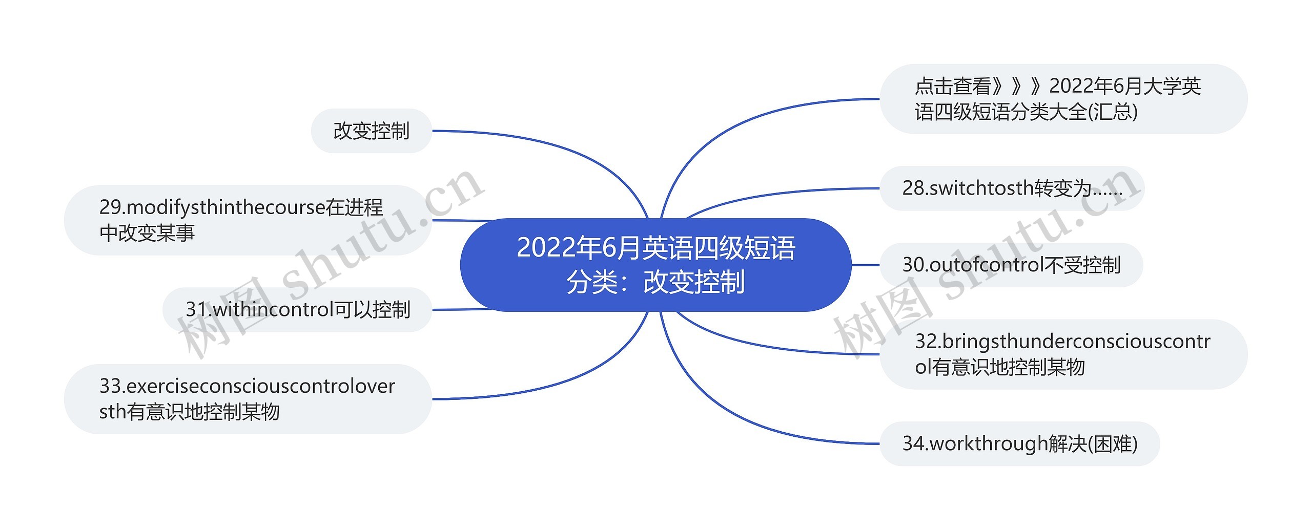 树图思维导图提供《2022年6月英语四级短语分类:改变控制》在线思维导图免费制作,点击“编辑”按钮,可对《2022年6月英语四级短语分类:改变控制》进行在线思维导图编辑,本思维导图属于思维导图模板主题,文件编号是:c97bea54a3ac91ef8920045fec9cbccb