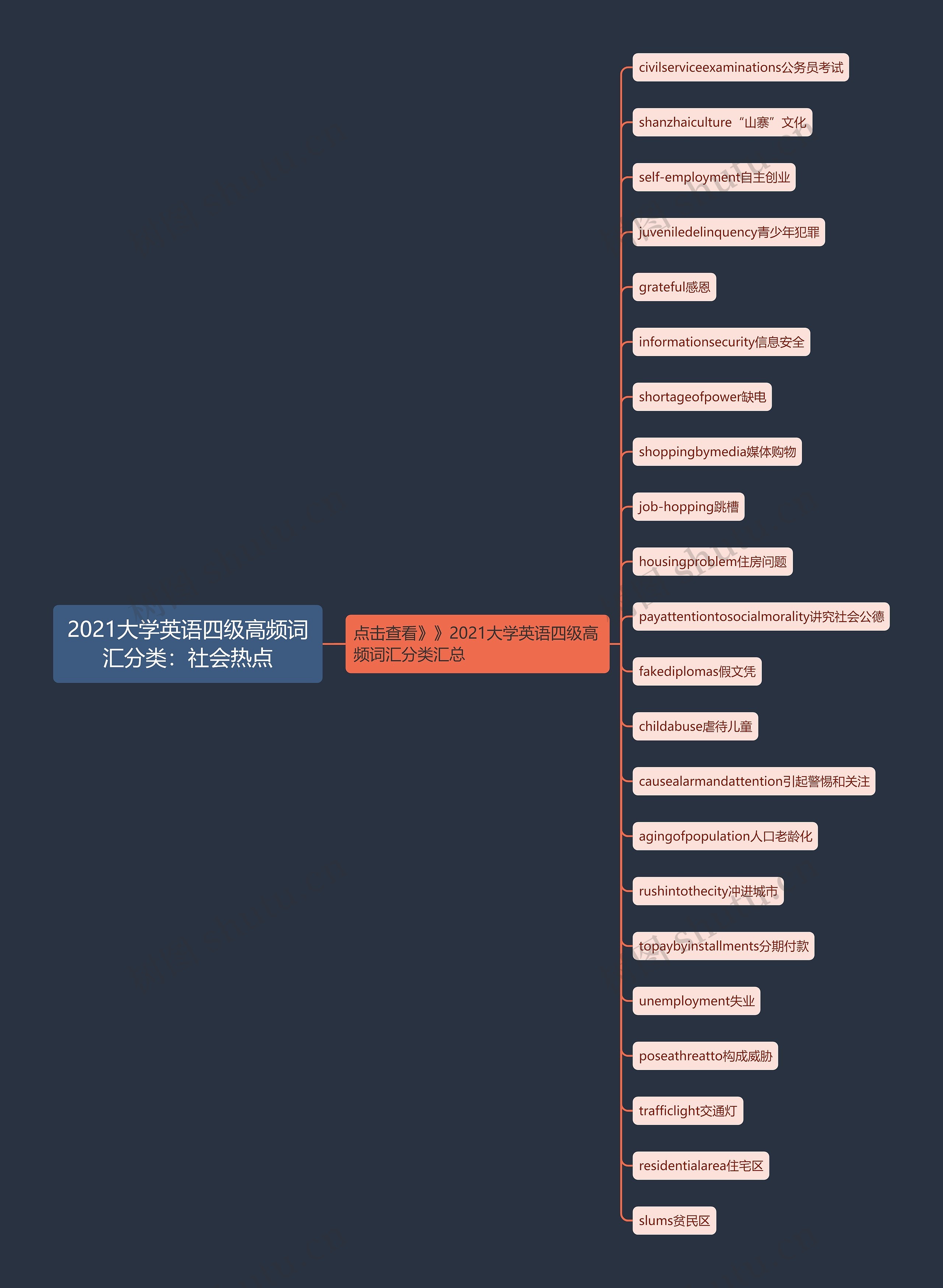 树图思维导图提供《2021大学英语四级高频词汇分类:社会热点》在线思维导图免费制作,点击“编辑”按钮,可对《2021大学英语四级高频词汇分类:社会热点》进行在线思维导图编辑,本思维导图属于思维导图模板主题,文件编号是:6712366f08810b4325ae107fb4693ada