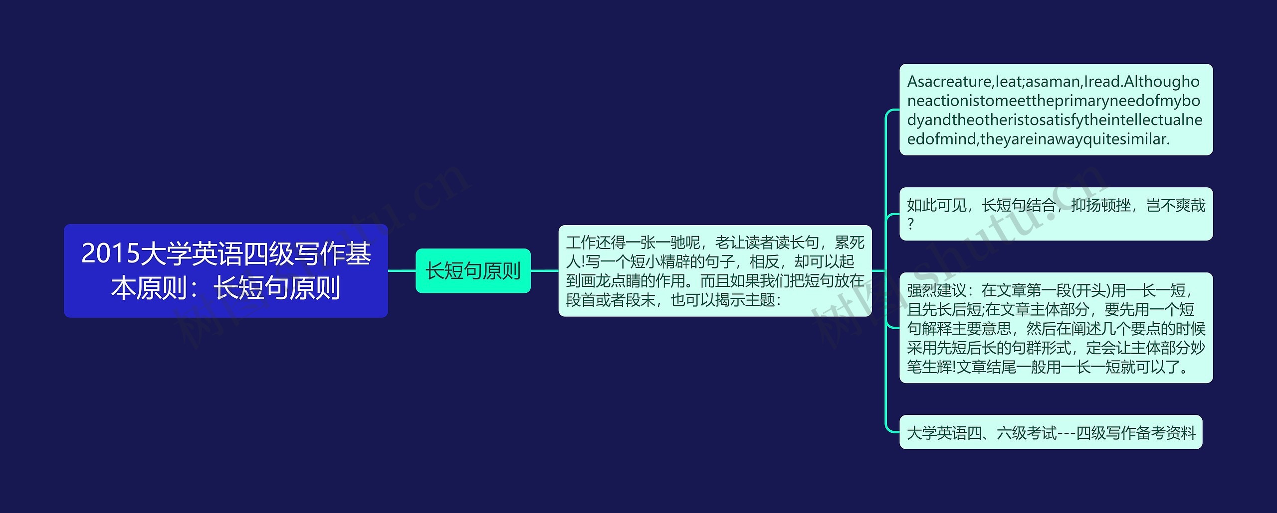 树图思维导图提供《2015大学英语四级写作基本原则:长短句原则》在线思维导图免费制作,点击“编辑”按钮,可对《2015大学英语四级写作基本原则:长短句原则》进行在线思维导图编辑,本思维导图属于思维导图模板主题,文件编号是:30460f07ce1fdf6412fec424de80fce3
