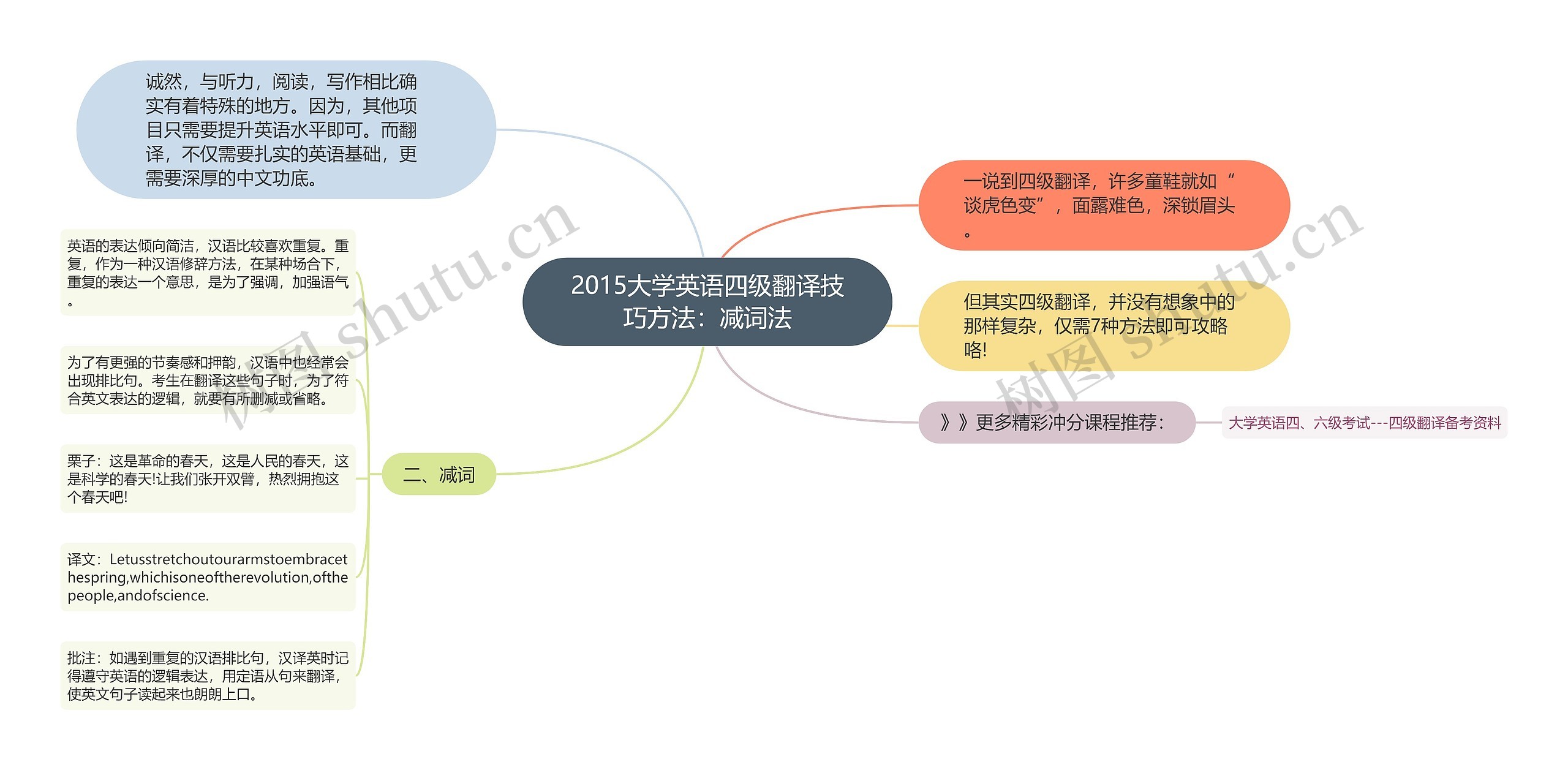 树图思维导图提供《2015大学英语四级翻译技巧方法:减词法》在线思维导图免费制作,点击“编辑”按钮,可对《2015大学英语四级翻译技巧方法:减词法》进行在线思维导图编辑,本思维导图属于思维导图模板主题,文件编号是:735dd249a499e9750e24236bc98a63f5