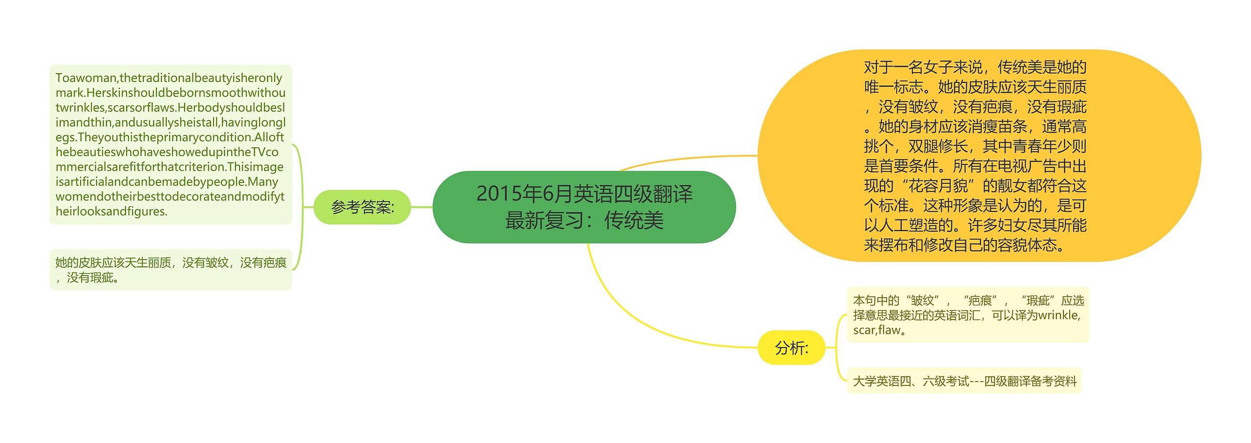 树图思维导图提供《2015年6月英语四级翻译最新复习:传统美》在线思维导图免费制作,点击“编辑”按钮,可对《2015年6月英语四级翻译最新复习:传统美》进行在线思维导图编辑,本思维导图属于思维导图模板主题,文件编号是:9f54f614806d26e53a6b153d674fc0ea