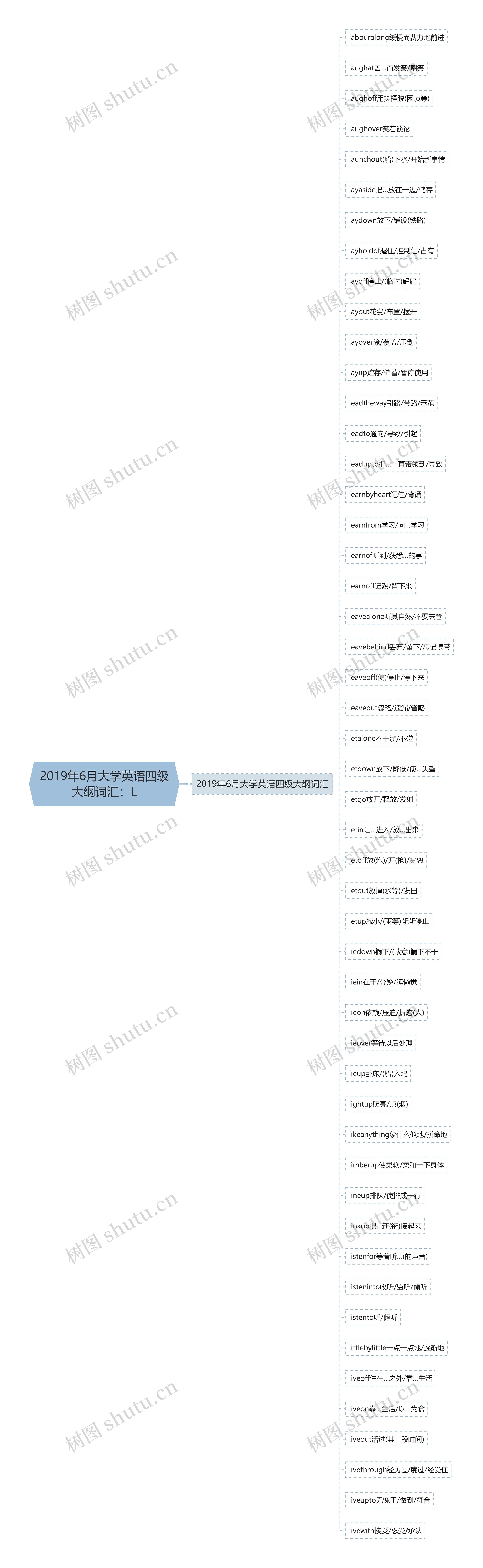 树图思维导图提供《2019年6月大学英语四级大纲词汇:L》在线思维导图免费制作,点击“编辑”按钮,可对《2019年6月大学英语四级大纲词汇:L》进行在线思维导图编辑,本思维导图属于思维导图模板主题,文件编号是:ecac950e420d2e576033ec995b5e17f3