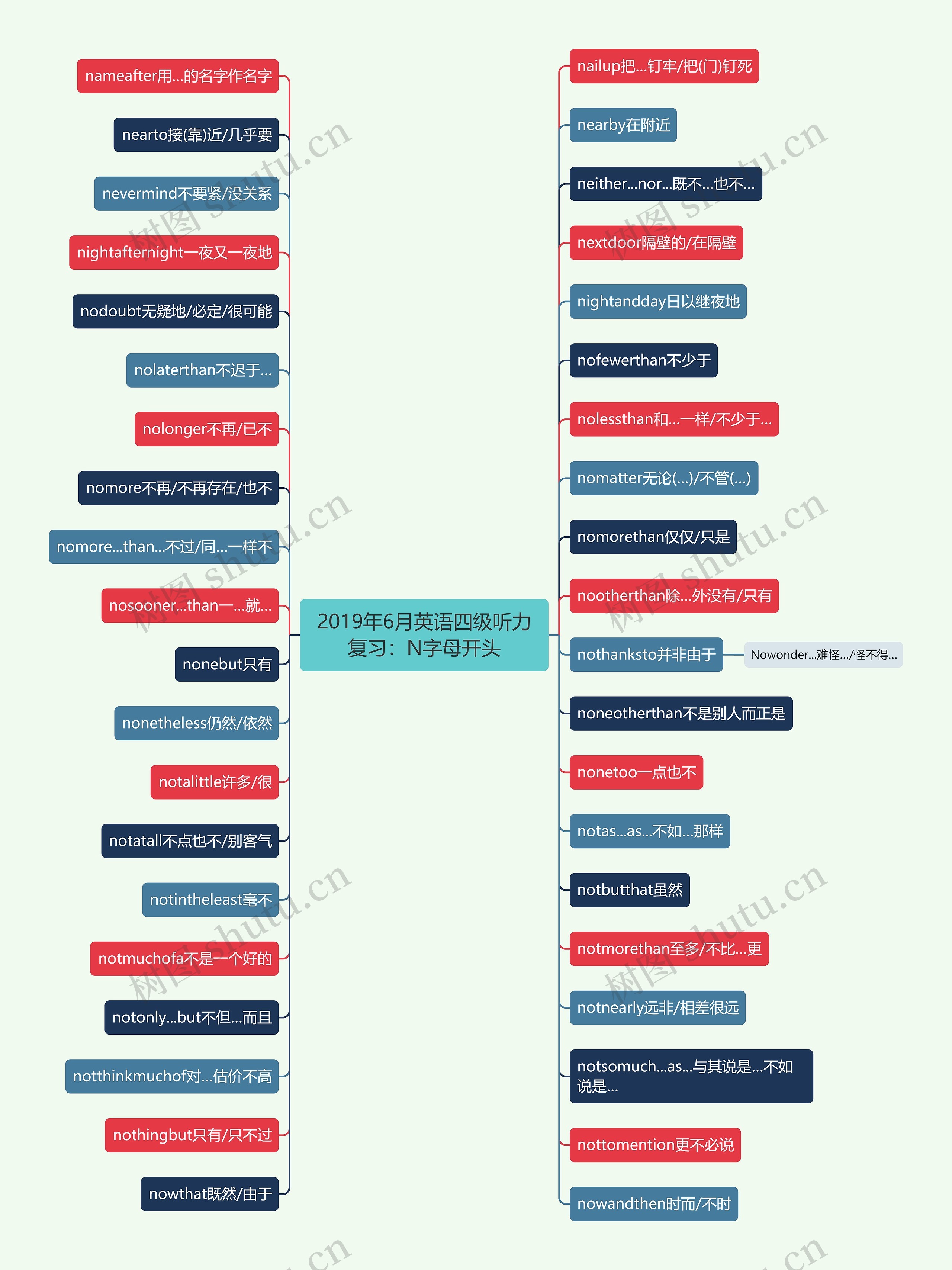 树图思维导图提供《2019年6月英语四级听力复习:N字母开头》在线思维导图免费制作,点击“编辑”按钮,可对《2019年6月英语四级听力复习:N字母开头》进行在线思维导图编辑,本思维导图属于思维导图模板主题,文件编号是:51b5c3e73f3d609362392cd3583cfd7b