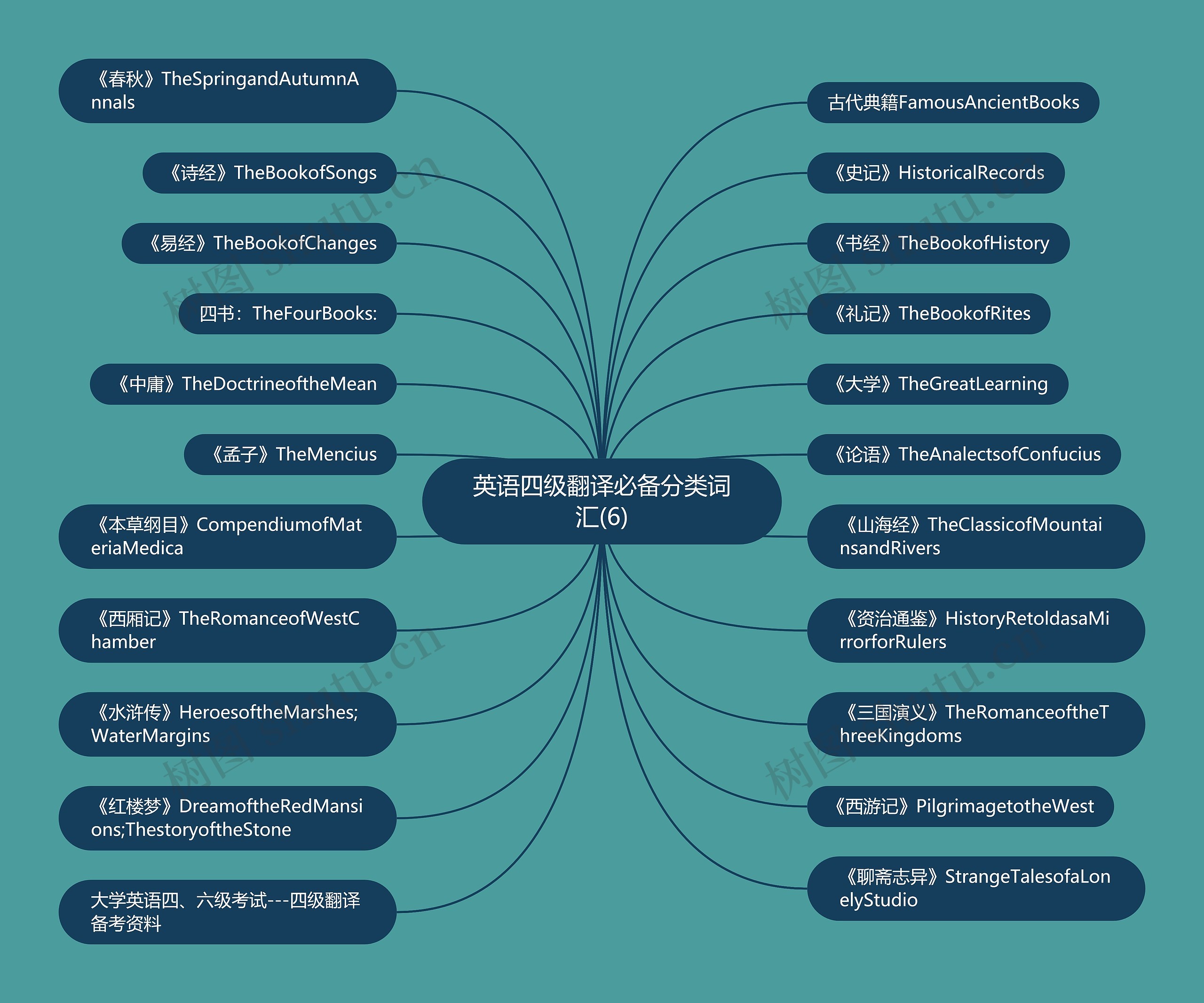 树图思维导图提供《英语四级翻译必备分类词汇(6)》在线思维导图免费制作,点击“编辑”按钮,可对《英语四级翻译必备分类词汇(6)》进行在线思维导图编辑,本思维导图属于思维导图模板主题,文件编号是:df1e4139e5e4e86c6d6e72fd72e5c427