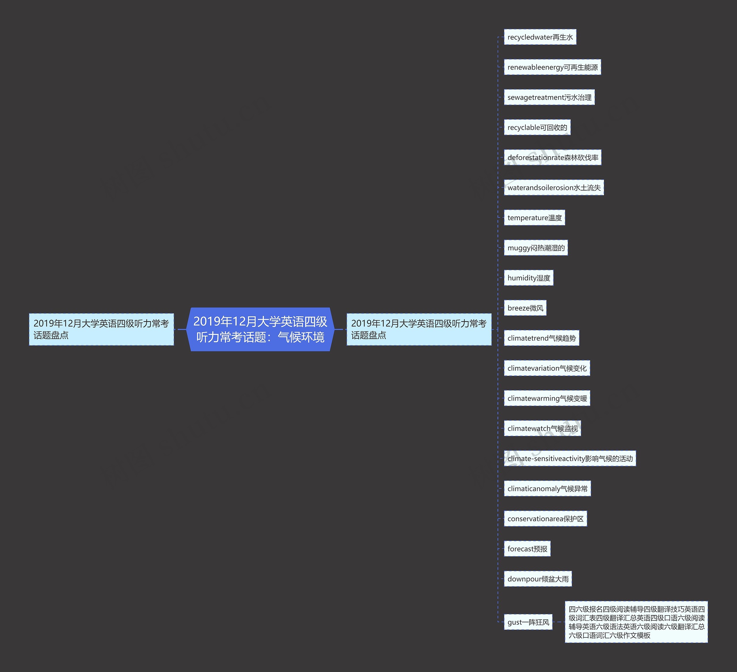 树图思维导图提供《2019年12月大学英语四级听力常考话题:气候环境》在线思维导图免费制作,点击“编辑”按钮,可对《2019年12月大学英语四级听力常考话题:气候环境》进行在线思维导图编辑,本思维导图属于思维导图模板主题,文件编号是:cb682cccf97c315d61cd7c32666d03f8