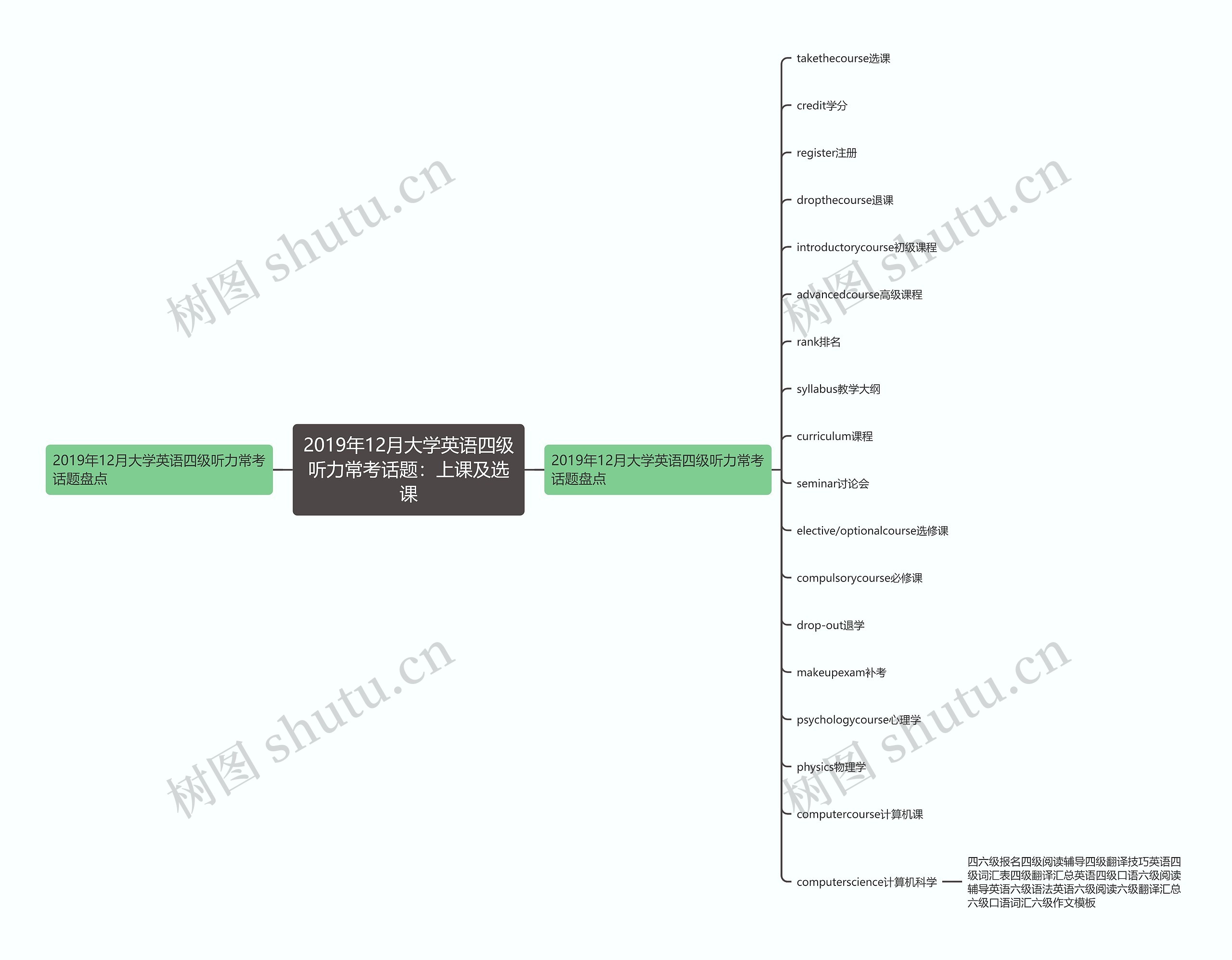 树图思维导图提供《2019年12月大学英语四级听力常考话题:上课及选课》在线思维导图免费制作,点击“编辑”按钮,可对《2019年12月大学英语四级听力常考话题:上课及选课》进行在线思维导图编辑,本思维导图属于思维导图模板主题,文件编号是:06ab9c614f5e89601bf6820a89c65c19