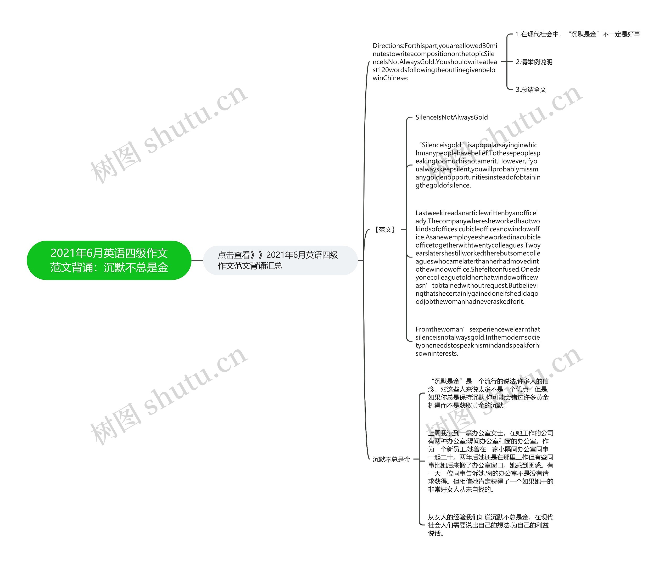 树图思维导图提供《2021年6月英语四级作文范文背诵:沉默不总是金》在线思维导图免费制作,点击“编辑”按钮,可对《2021年6月英语四级作文范文背诵:沉默不总是金》进行在线思维导图编辑,本思维导图属于思维导图模板主题,文件编号是:2612b605266b3c5bbc4d7d0feab3937e