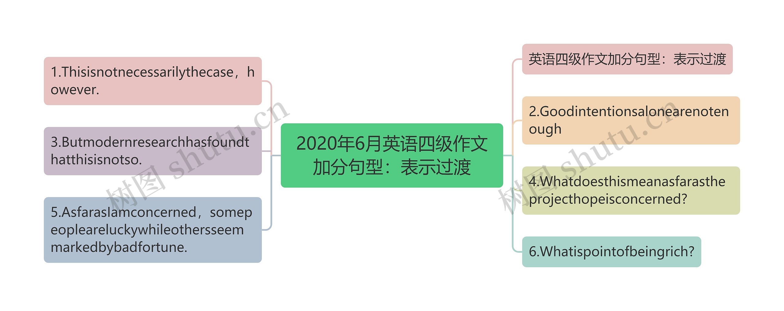 树图思维导图提供《2020年6月英语四级作文加分句型:表示过渡》在线思维导图免费制作,点击“编辑”按钮,可对《2020年6月英语四级作文加分句型:表示过渡》进行在线思维导图编辑,本思维导图属于思维导图模板主题,文件编号是:714a7b305c1b4de485bf3dc32da84a85