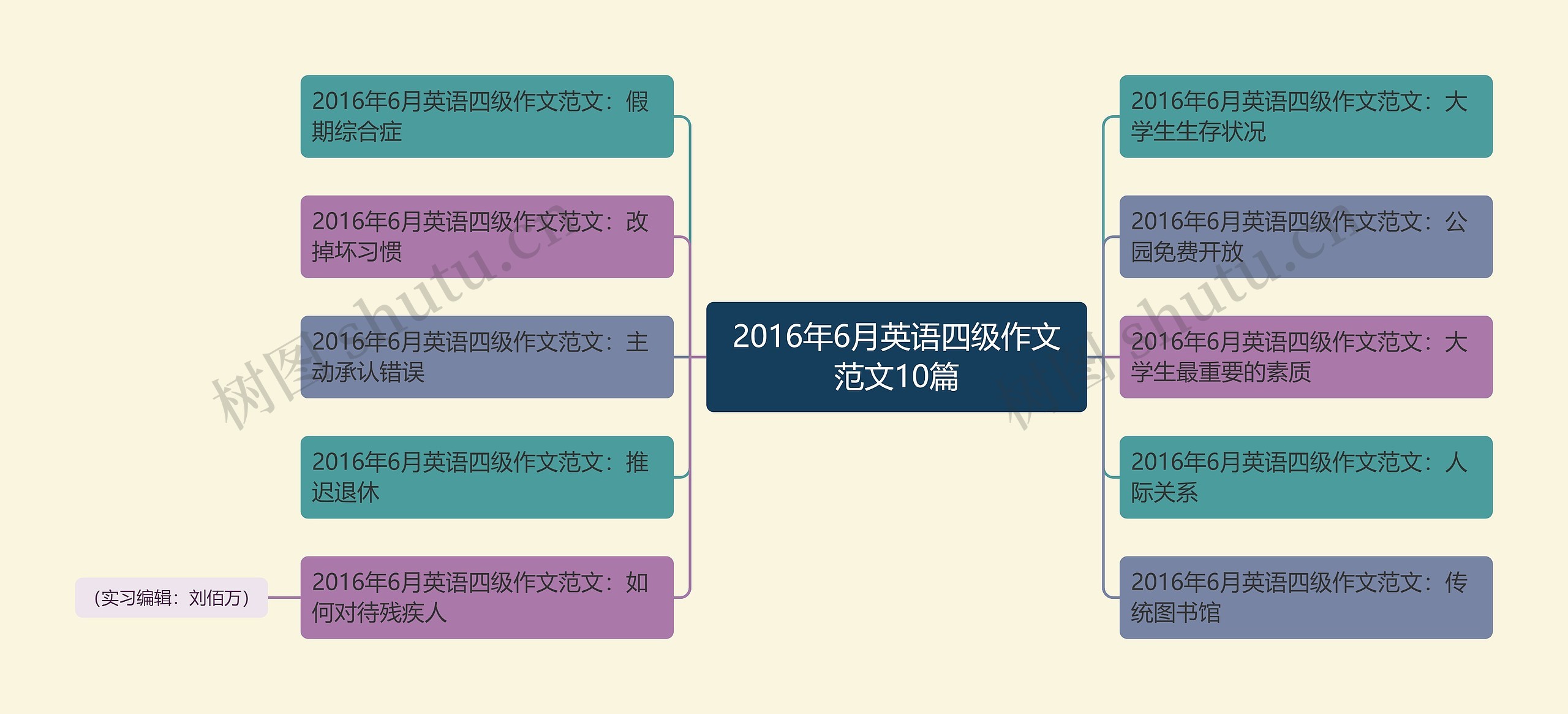 树图思维导图提供《2016年6月英语四级作文范文10篇》在线思维导图免费制作,点击“编辑”按钮,可对《2016年6月英语四级作文范文10篇》进行在线思维导图编辑,本思维导图属于思维导图模板主题,文件编号是:efae8fd8beb98b5c271f9777596dc1e3