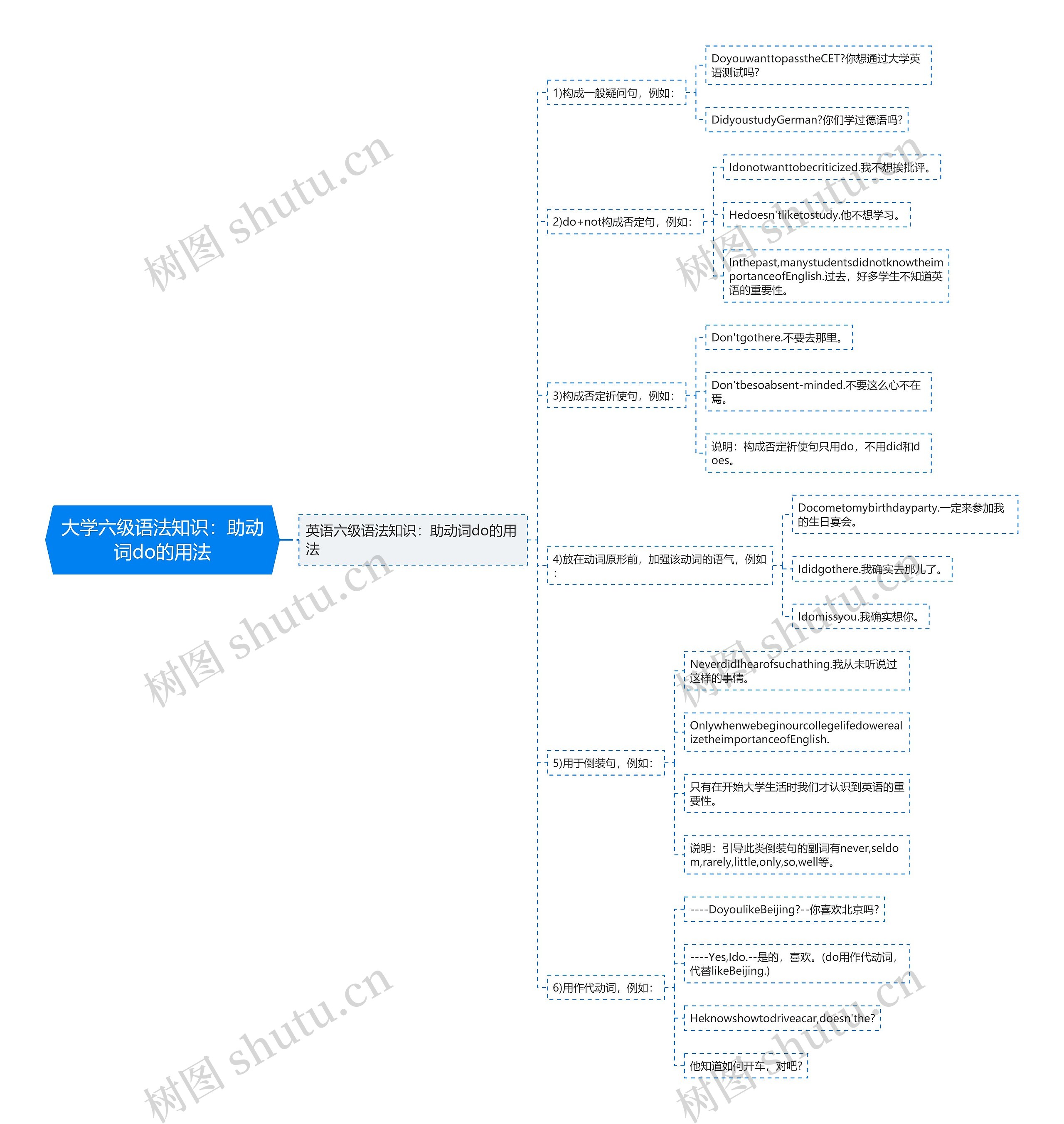 树图思维导图提供《大学六级语法知识:助动词do的用法》在线思维导图免费制作,点击“编辑”按钮,可对《大学六级语法知识:助动词do的用法》进行在线思维导图编辑,本思维导图属于思维导图模板主题,文件编号是:6e260ce3e5cdda58e28d0cb944495be7
