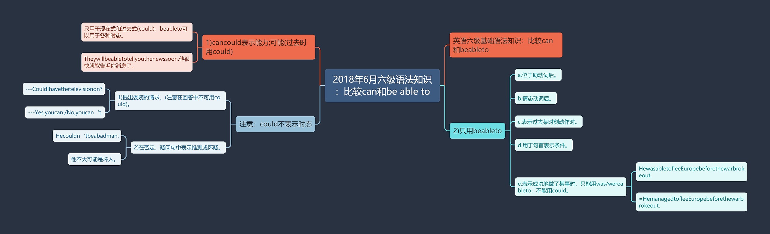 树图思维导图提供《2018年6月六级语法知识:比较can和be able to》在线思维导图免费制作,点击“编辑”按钮,可对《2018年6月六级语法知识:比较can和be able to》进行在线思维导图编辑,本思维导图属于思维导图模板主题,文件编号是:1ad661b6a247fd641104056435402cc8