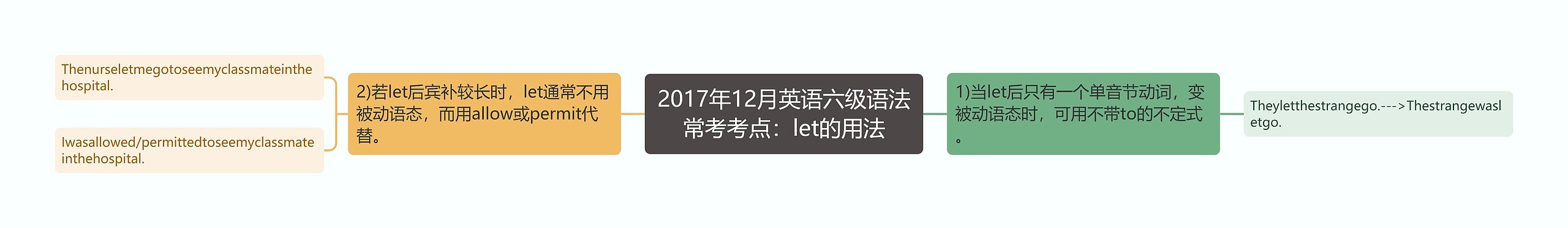 树图思维导图提供《2017年12月英语六级语法常考考点:let的用法》在线思维导图免费制作,点击“编辑”按钮,可对《2017年12月英语六级语法常考考点:let的用法》进行在线思维导图编辑,本思维导图属于思维导图模板主题,文件编号是:3a46f08c22fbbd741543d161d3785af7