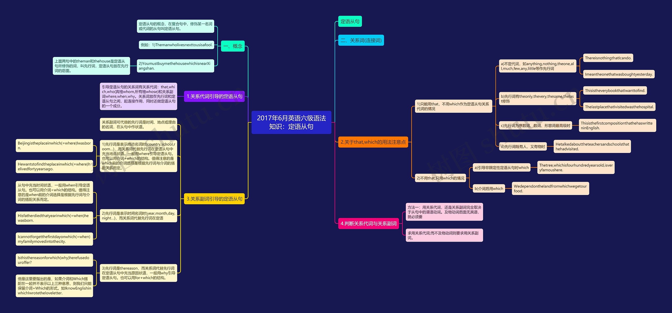 树图思维导图提供《2017年6月英语六级语法知识:定语从句》在线思维导图免费制作,点击“编辑”按钮,可对《2017年6月英语六级语法知识:定语从句》进行在线思维导图编辑,本思维导图属于思维导图模板主题,文件编号是:1d7222c87d7b5005eaa714a33f96310d