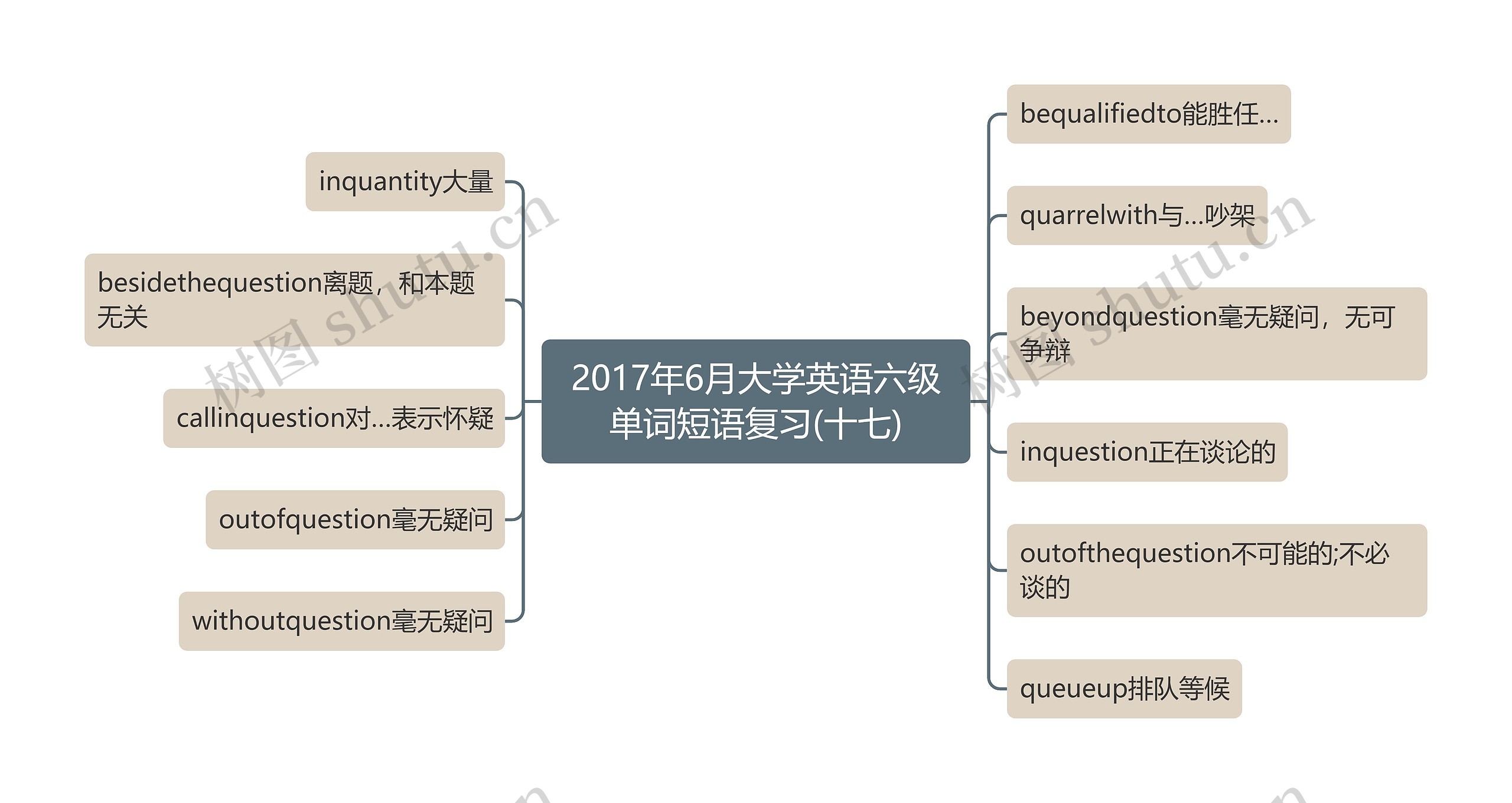 树图思维导图提供《2017年6月大学英语六级单词短语复习(十七)》在线思维导图免费制作,点击“编辑”按钮,可对《2017年6月大学英语六级单词短语复习(十七)》进行在线思维导图编辑,本思维导图属于思维导图模板主题,文件编号是:637c8a443ed63dc498b9ba868ee61a59