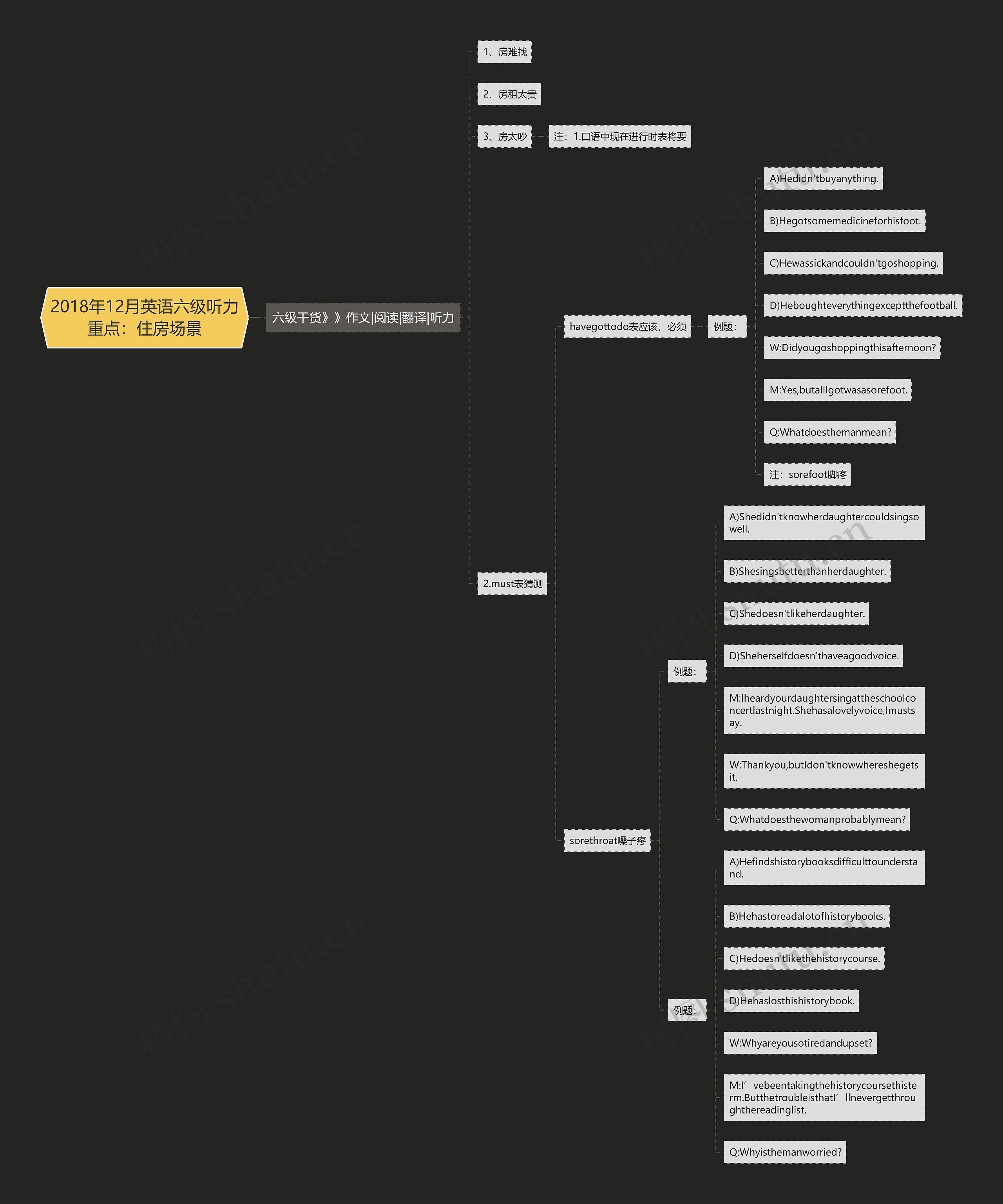 树图思维导图提供《2018年12月英语六级听力重点:住房场景》在线思维导图免费制作,点击“编辑”按钮,可对《2018年12月英语六级听力重点:住房场景》进行在线思维导图编辑,本思维导图属于思维导图模板主题,文件编号是:af48c305ba98a8ad646cfb3697433c17