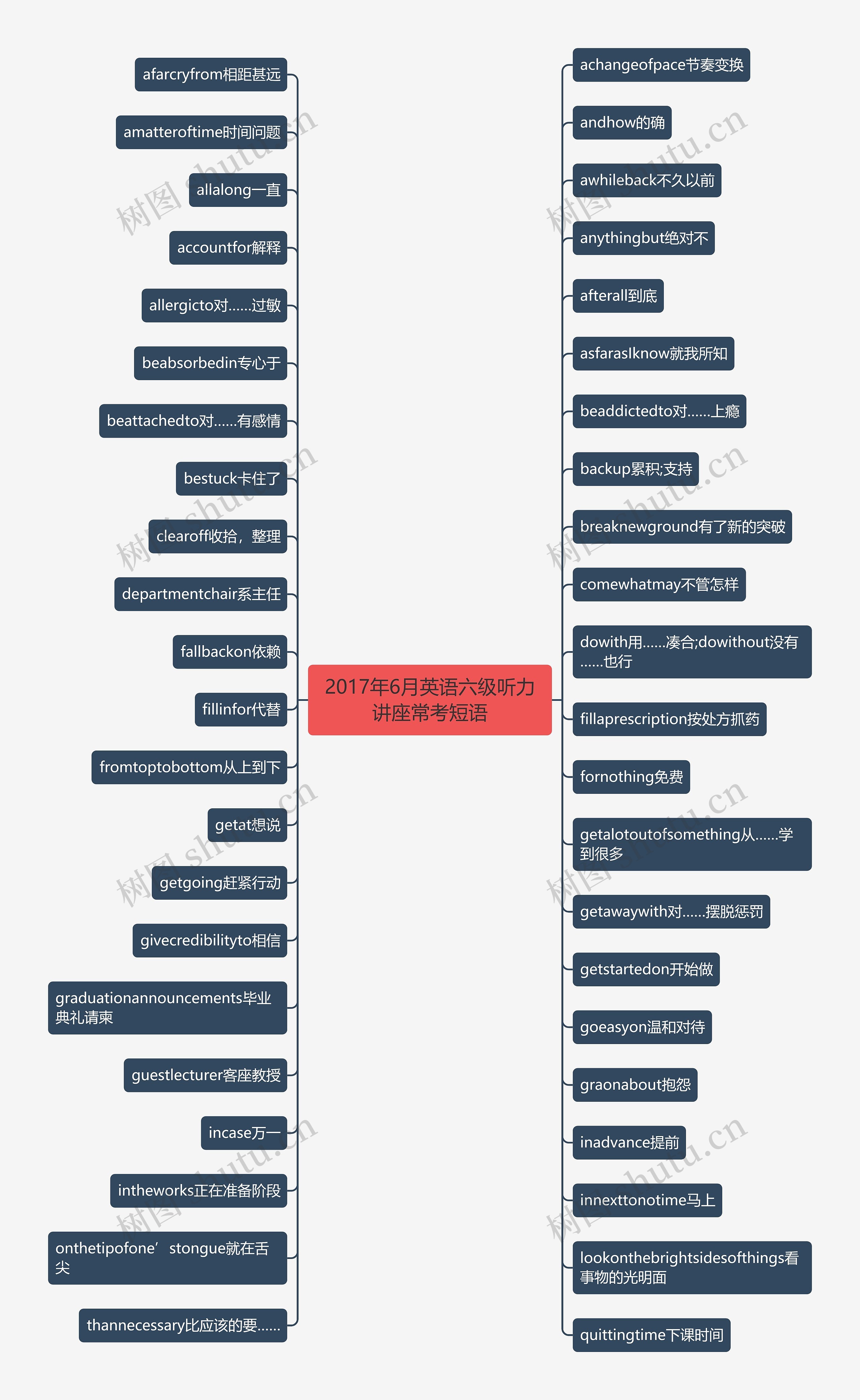 树图思维导图提供《2017年6月英语六级听力讲座常考短语》在线思维导图免费制作,点击“编辑”按钮,可对《2017年6月英语六级听力讲座常考短语》进行在线思维导图编辑,本思维导图属于思维导图模板主题,文件编号是:d6c8648914bbdad0d3a38690933b8897