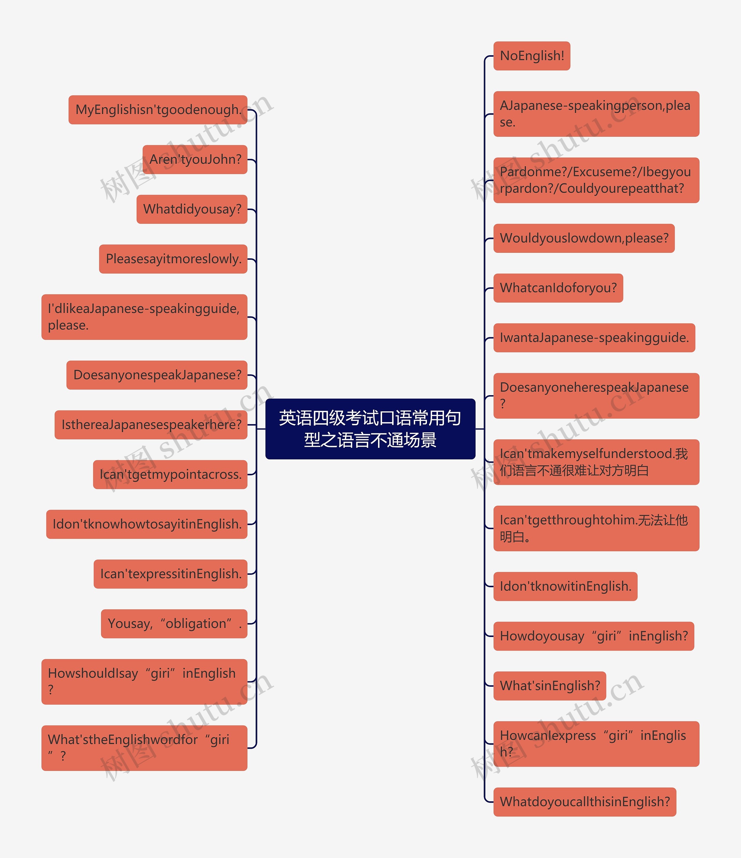 树图思维导图提供《英语四级考试口语常用句型之语言不通场景》在线思维导图免费制作,点击“编辑”按钮,可对《英语四级考试口语常用句型之语言不通场景》进行在线思维导图编辑,本思维导图属于思维导图模板主题,文件编号是:5dfd2513ae8b27b8dc74477916eaff73