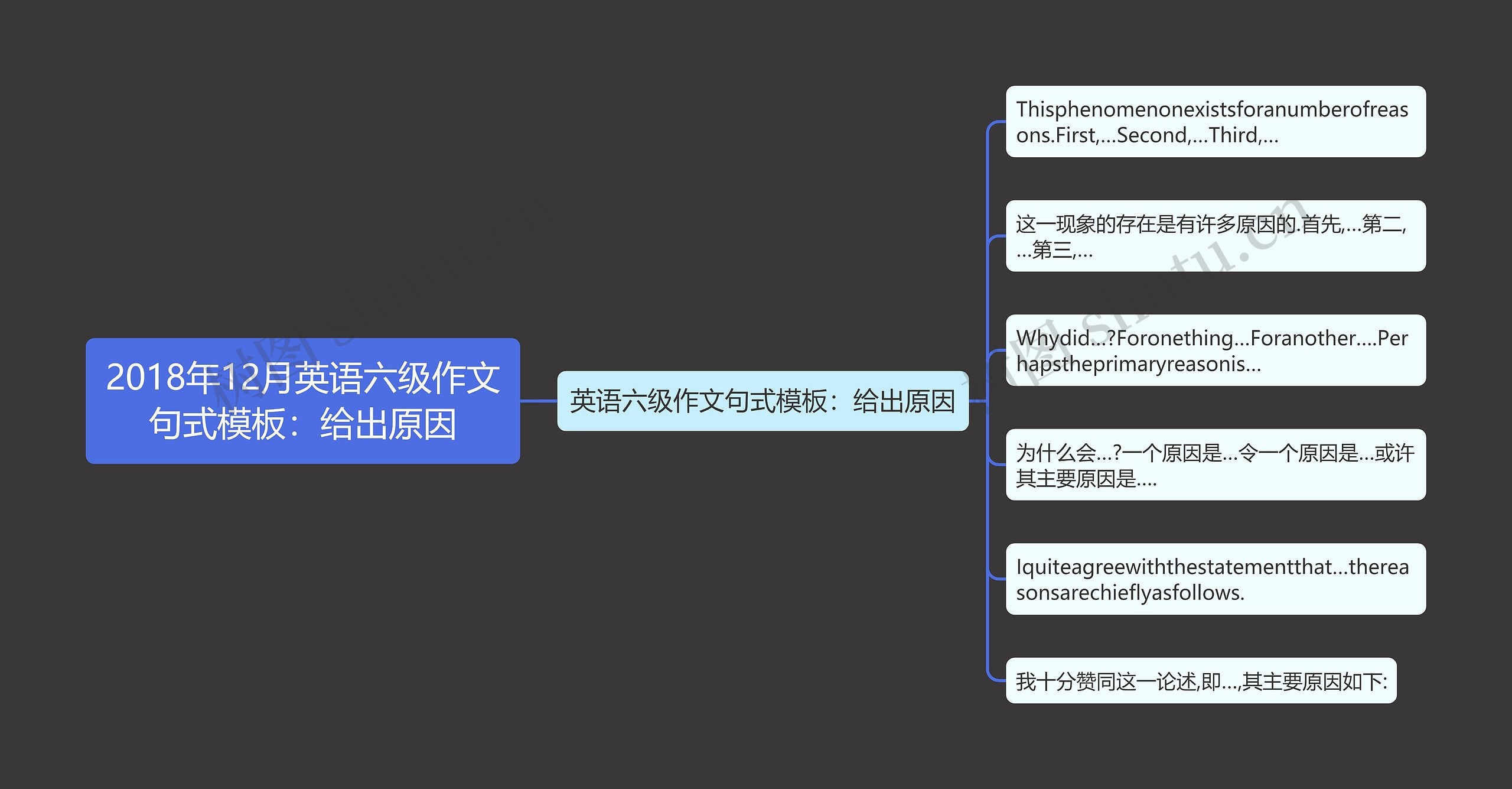 树图思维导图提供《2018年12月英语六级作文句式模板:给出原因》在线思维导图免费制作,点击“编辑”按钮,可对《2018年12月英语六级作文句式模板:给出原因》进行在线思维导图编辑,本思维导图属于思维导图模板主题,文件编号是:0566756d71a434b84c5046b8a31dee95