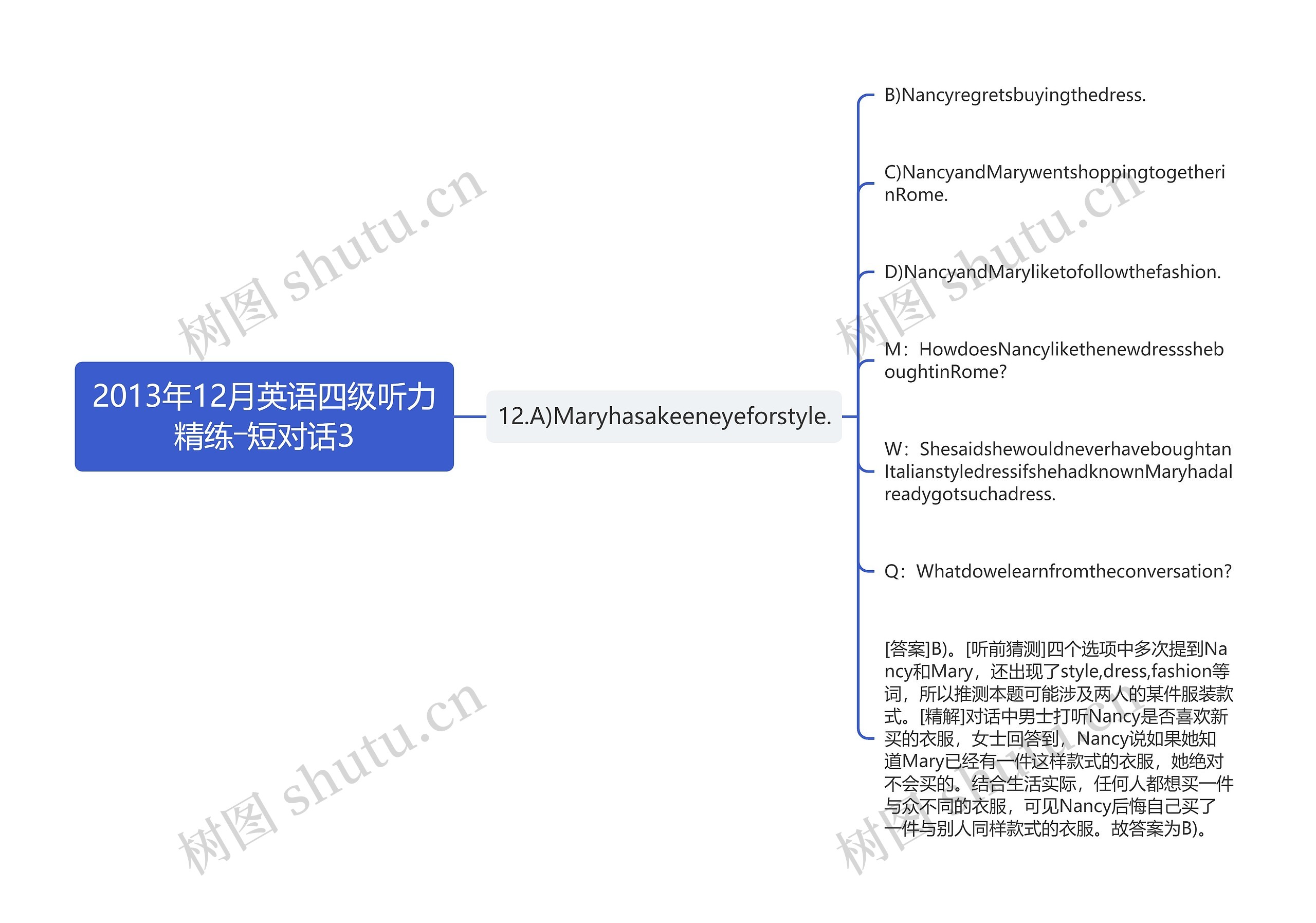 树图思维导图提供《2013年12月英语四级听力精练―短对话3》在线思维导图免费制作,点击“编辑”按钮,可对《2013年12月英语四级听力精练―短对话3》进行在线思维导图编辑,本思维导图属于思维导图模板主题,文件编号是:4cf1a03f415c95365a1c65b3cac130ed